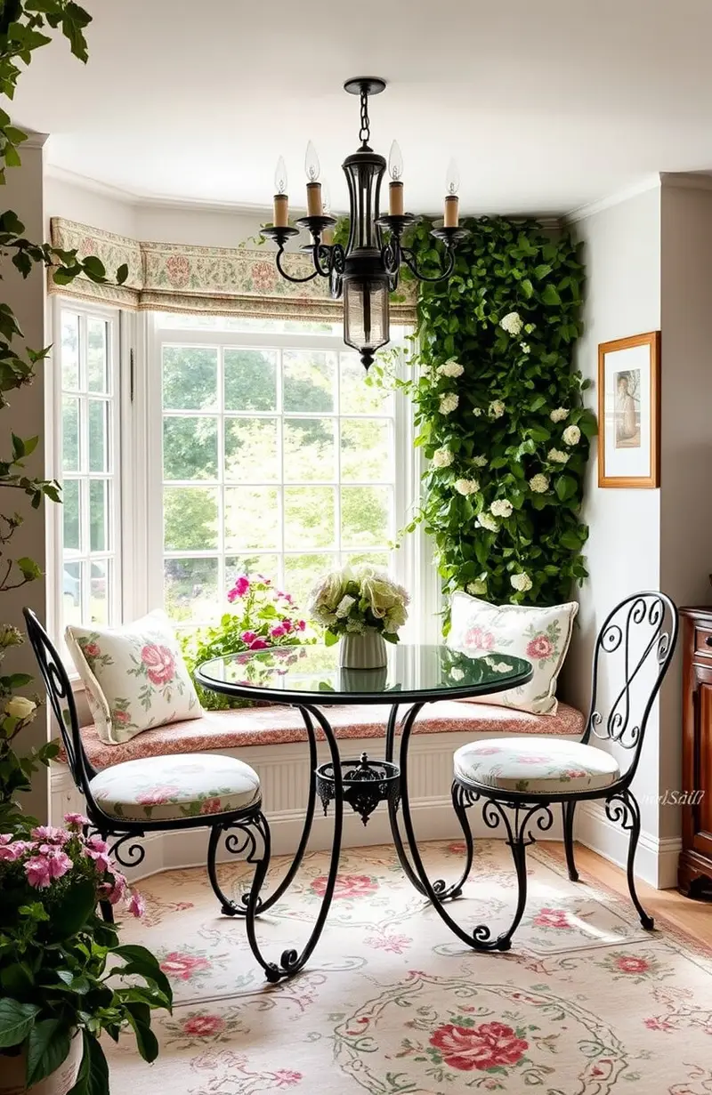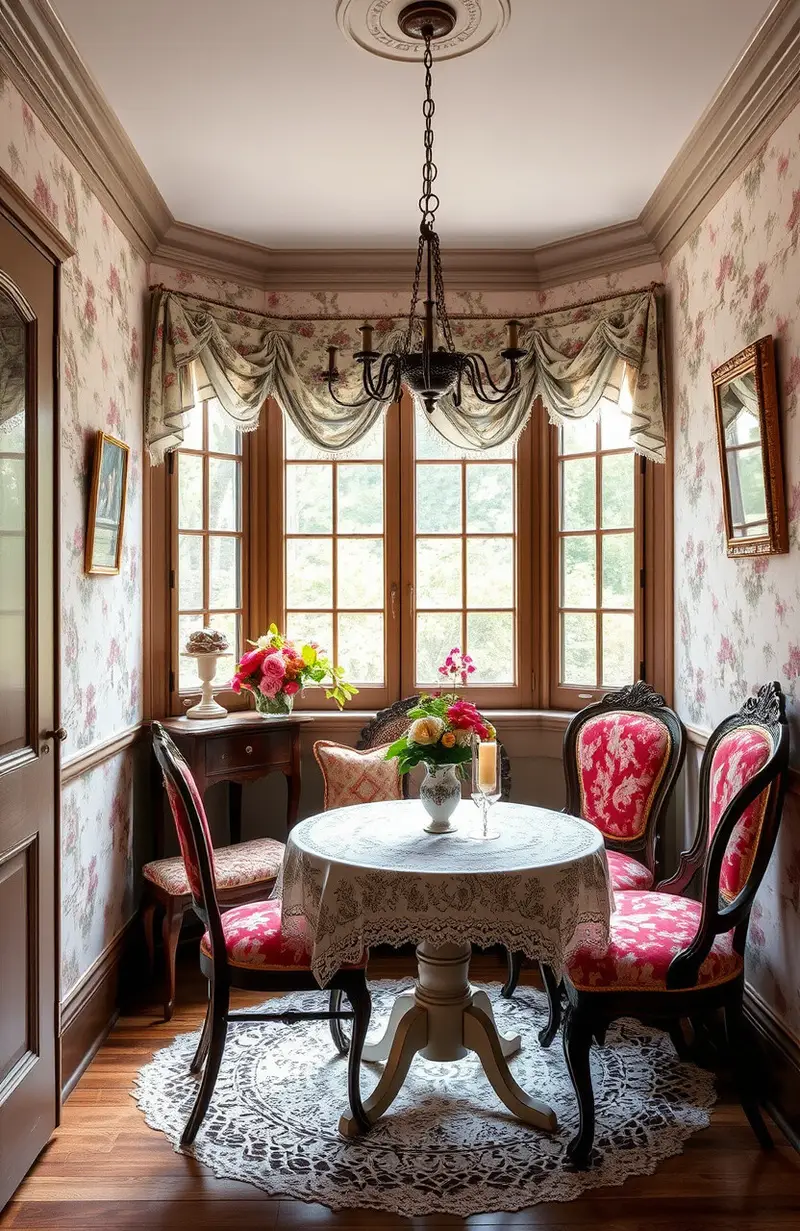 Create a dining nook reminiscent of an English garden. Use floral patterns, antique furniture, and soft colors.