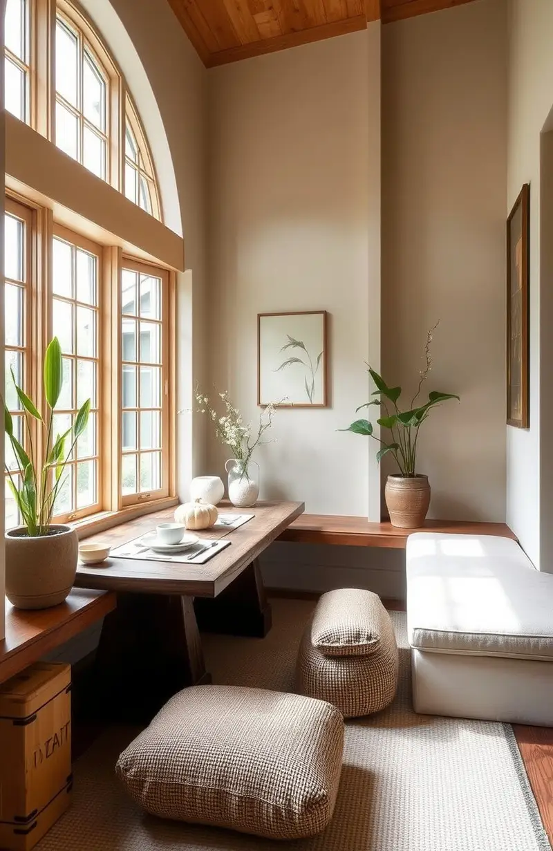 Create a peaceful oasis with a Zen-inspired dining nook. Use natural materials, soft colors, and minimalist design.