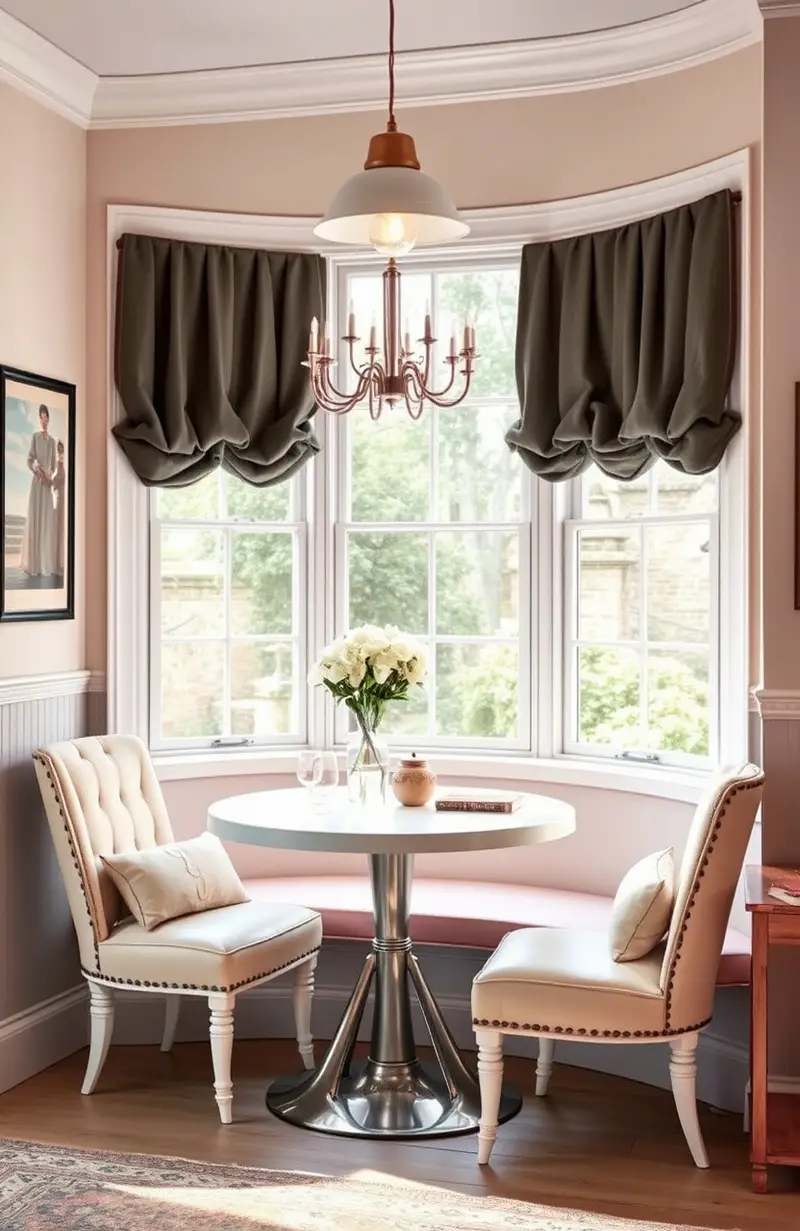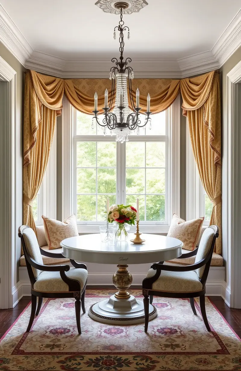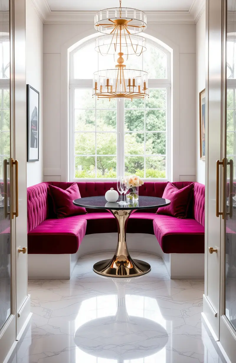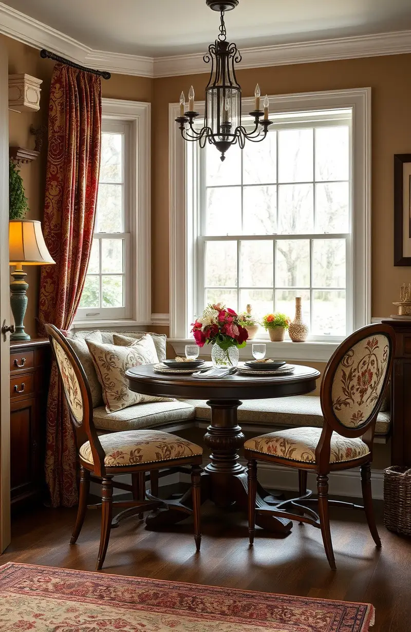Step back in time with a vintage glamour dining nook. Use luxurious fabrics, antique furniture, and elegant lighting.