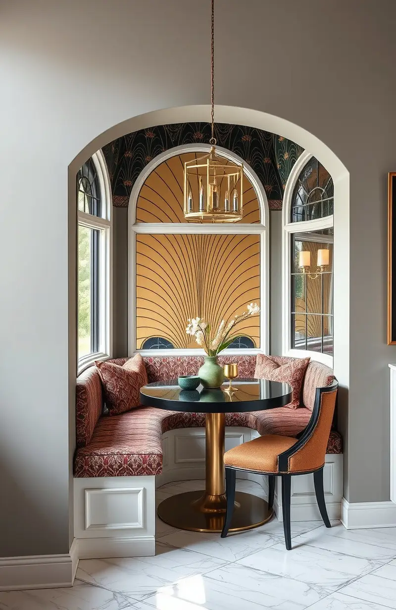 Step into the roaring twenties with an Art Deco-inspired nook. Use geometric patterns, bold colors, and lavish materials.