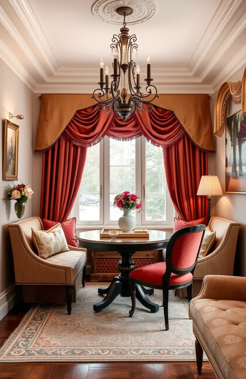 Create a luxurious getaway with an elegant-inspired nook. Use rich fabrics, ornate decor, and soft lighting.
