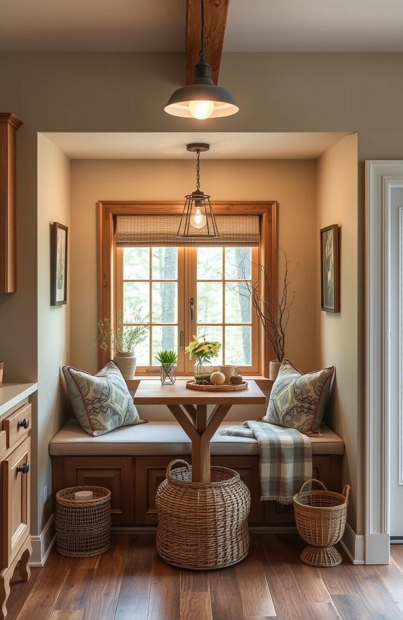 Bring the countryside into your home with a rustic farmhouse nook. Wood elements and soft fabrics make it special.