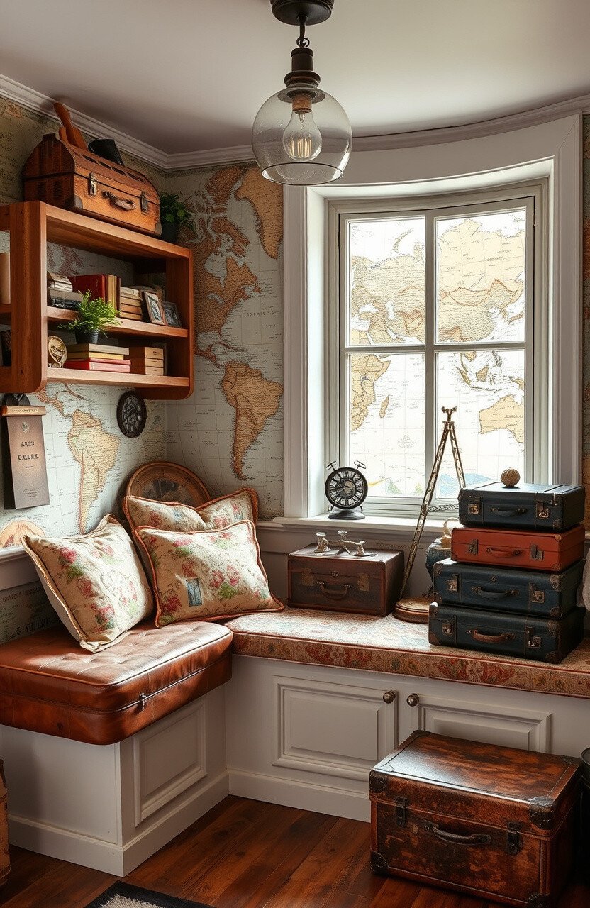 Picture old maps and travel memorabilia. This nook is a tribute to wanderlust.