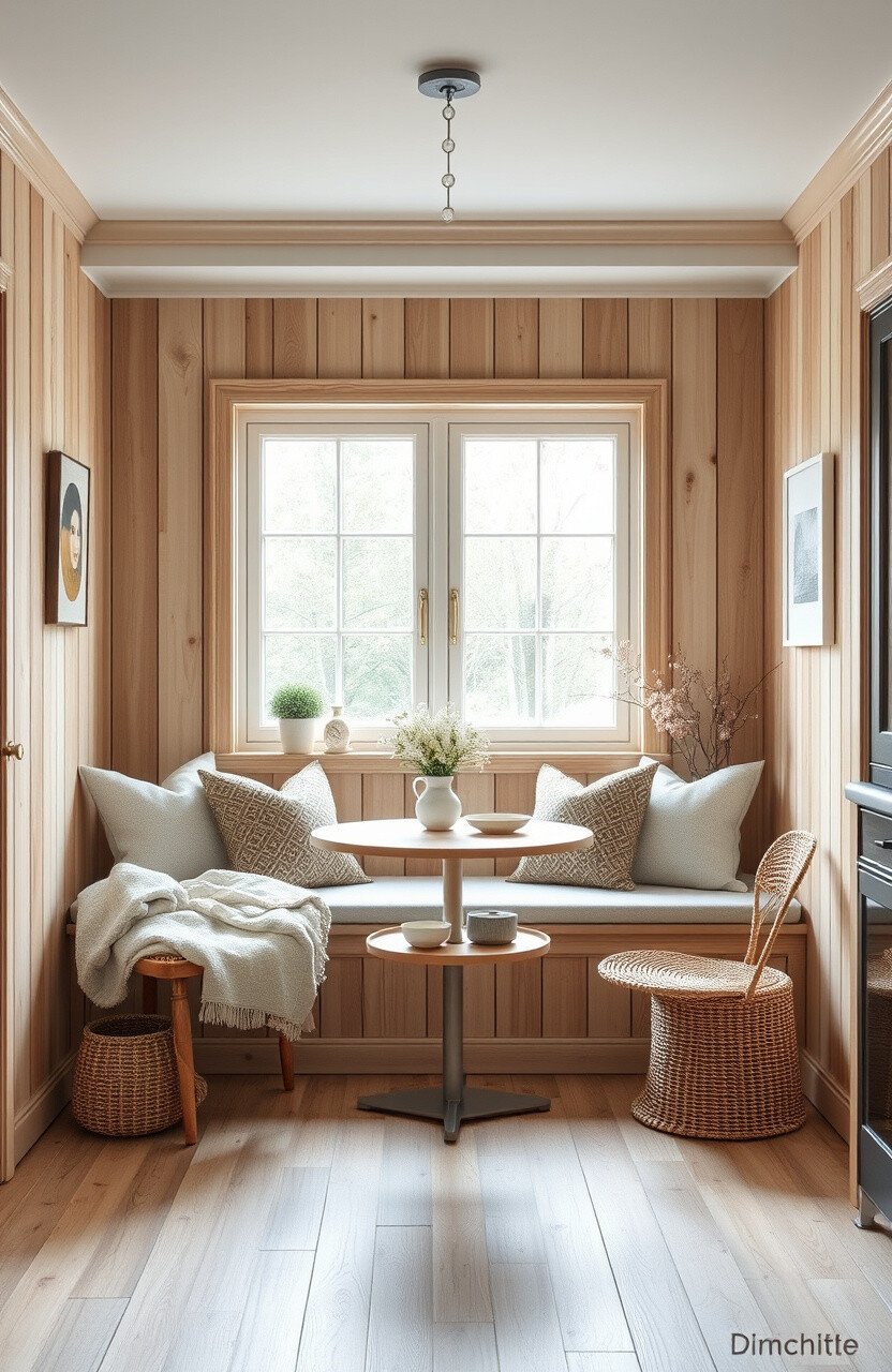 Think light wood and natural fabrics. This nook is all about simplicity and warmth.