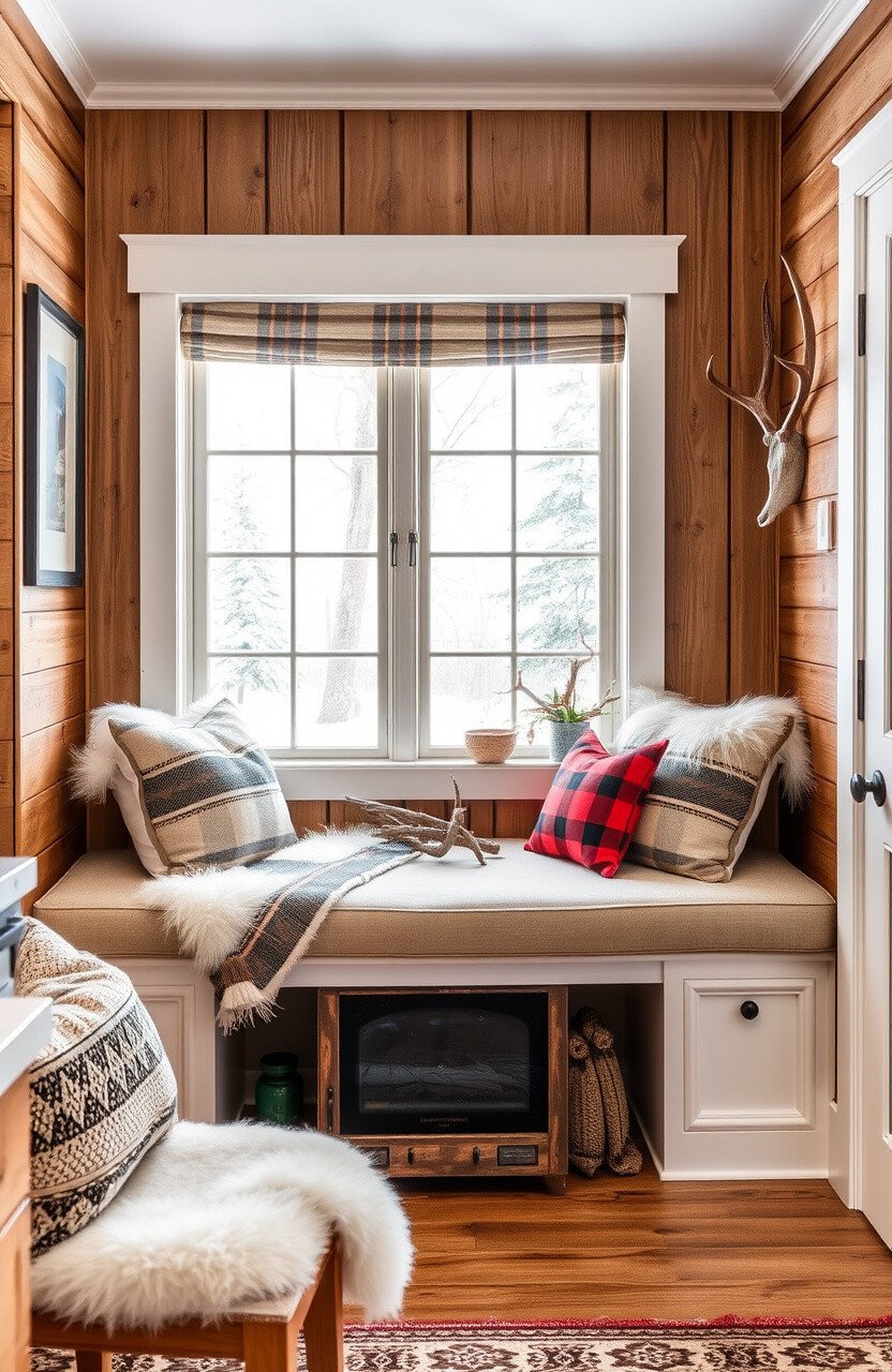 Think wood paneling and cozy fabrics. This nook is a warm embrace in a snowy landscape.