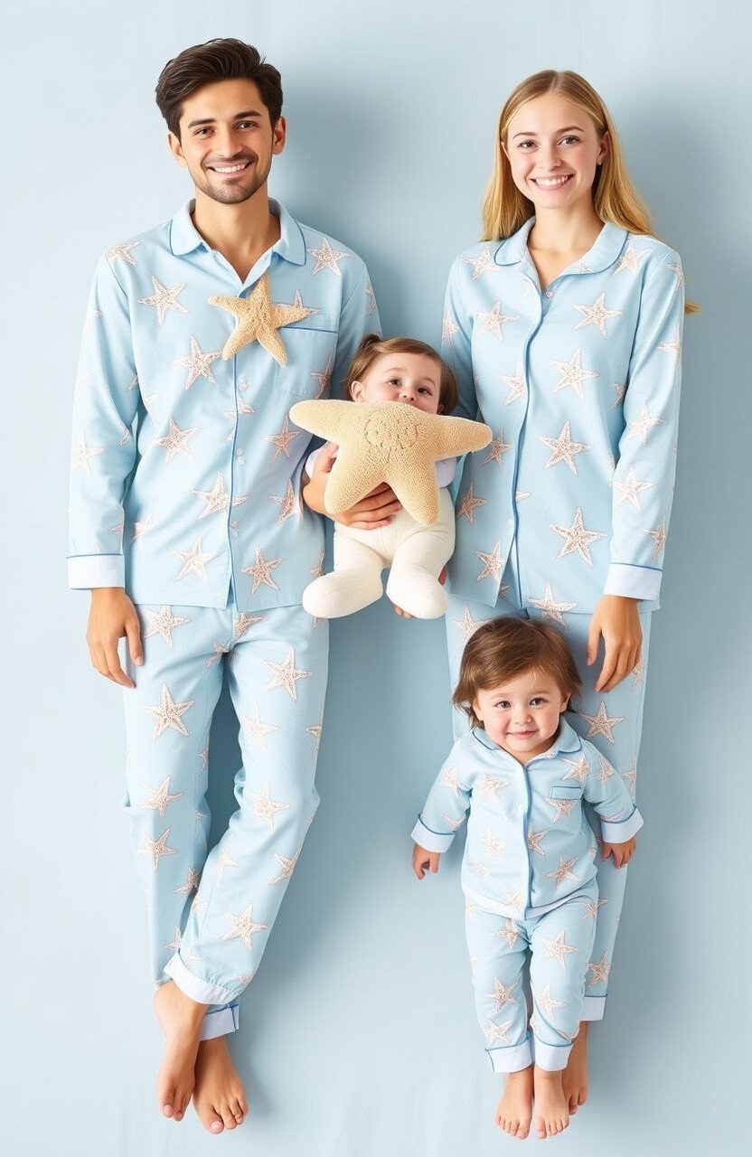 These pajamas are made from high-quality cotton, ensuring a comfortable and restful sleep. Add matching starfish plush toys for the kids to snuggle with, completing the oceanic experience.