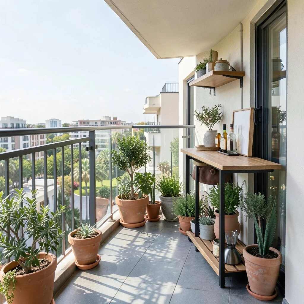 A slim bar shelf can turn a narrow balcony into a fun hangout spot. It gives you a place for drinks, snacks, or a morning cup of tea.