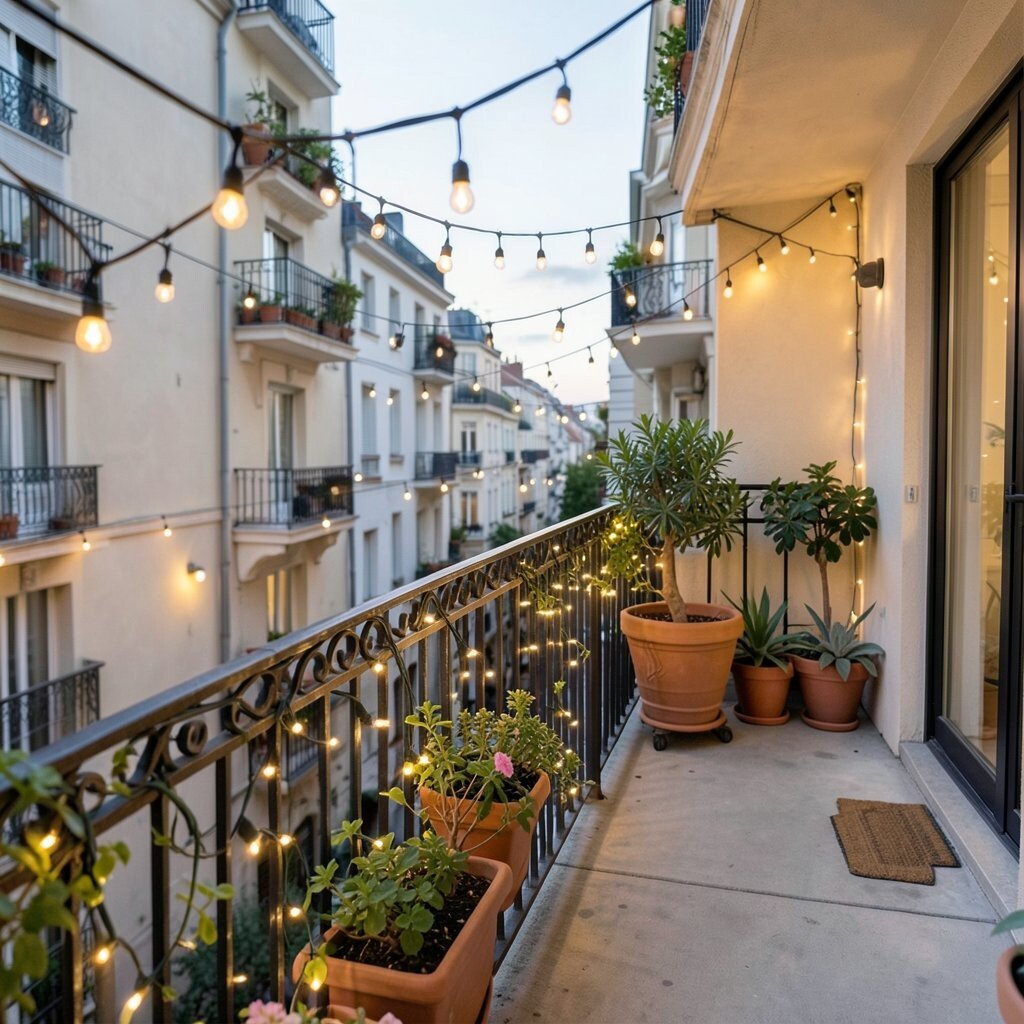 String lights can make even the smallest balcony feel magical. Their gentle shine adds warmth after sunset and makes the space feel cozy.