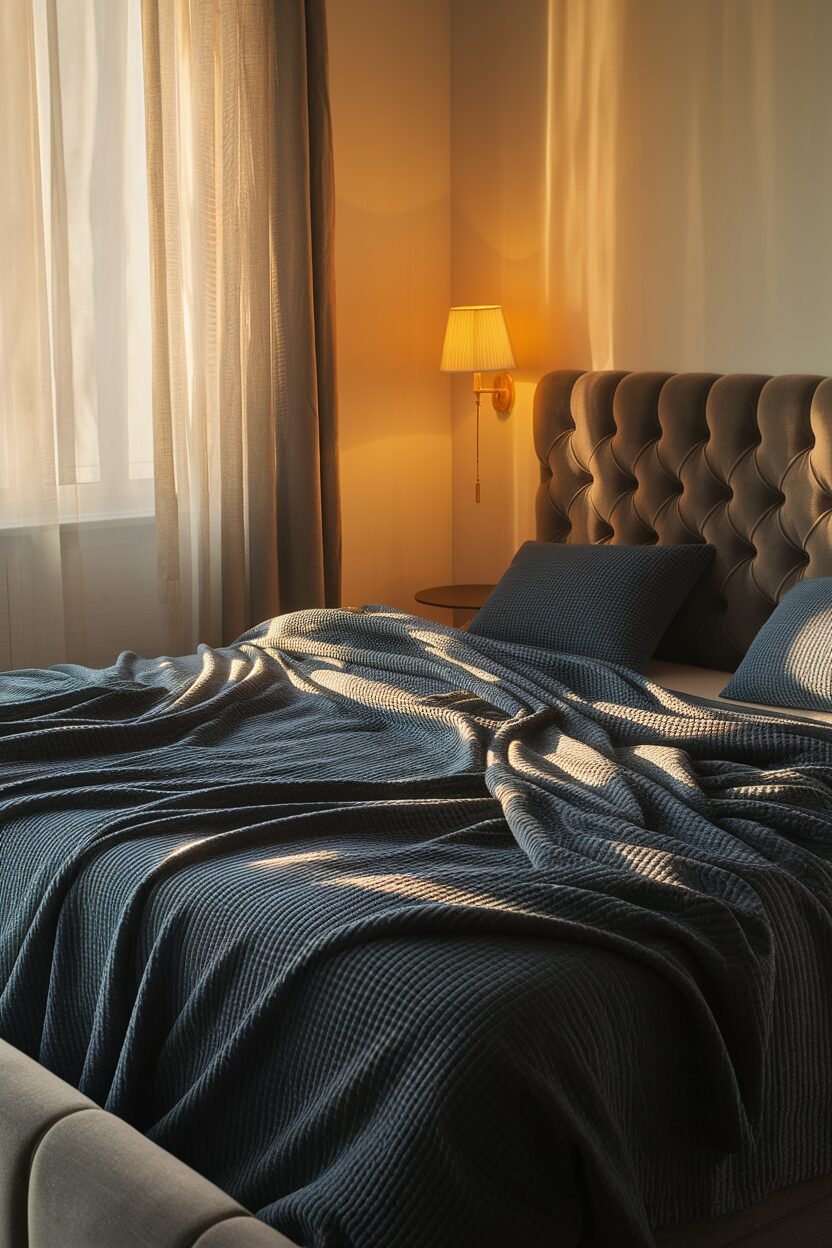 Navy blue is a bold choice that brings depth and sophistication to any bedroom. It’s like a night sky wrapped around you, making your space feel cozy and serene.