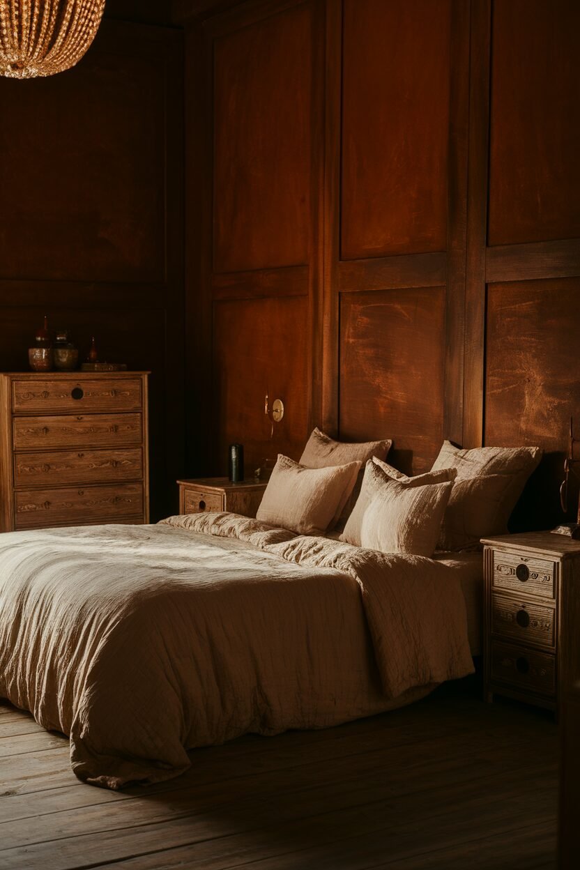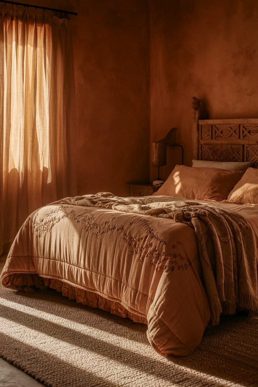 Rustic terra cotta brings a warm, earthy vibe to your bedroom. It’s like a cozy sunset, making your space feel inviting and grounded!