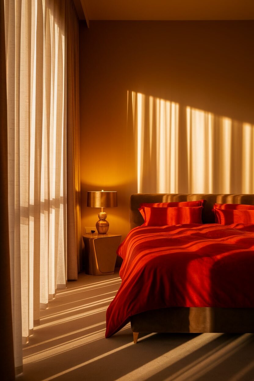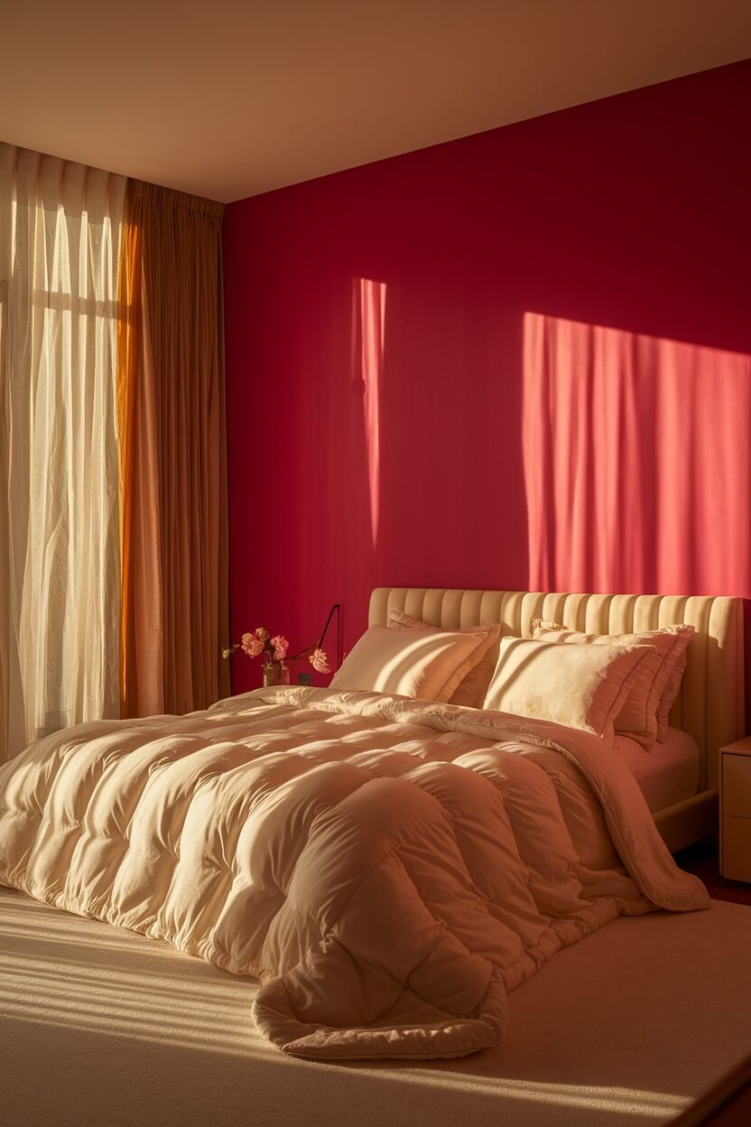 Bright cherry red is a bold and lively color that can energize your bedroom. It’s like a burst of joy, making your space feel vibrant and exciting!
