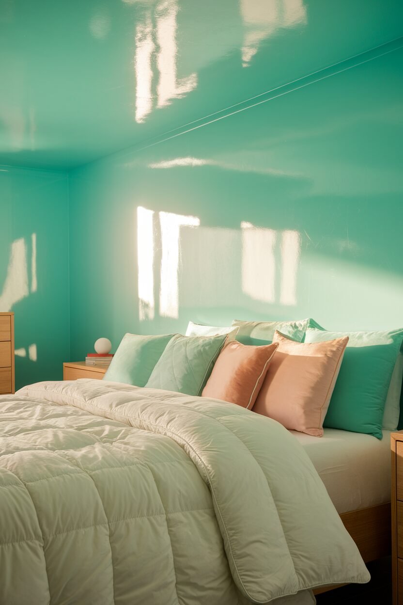 Bright aqua is a fun and playful color that can breathe life into your bedroom. It’s like a splash of ocean waves, making your space feel refreshing and lively!