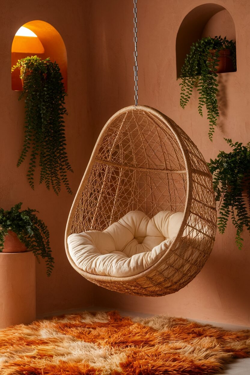 Hanging chairs add a fun and whimsical touch. They’re a cozy spot for relaxing or reading.
