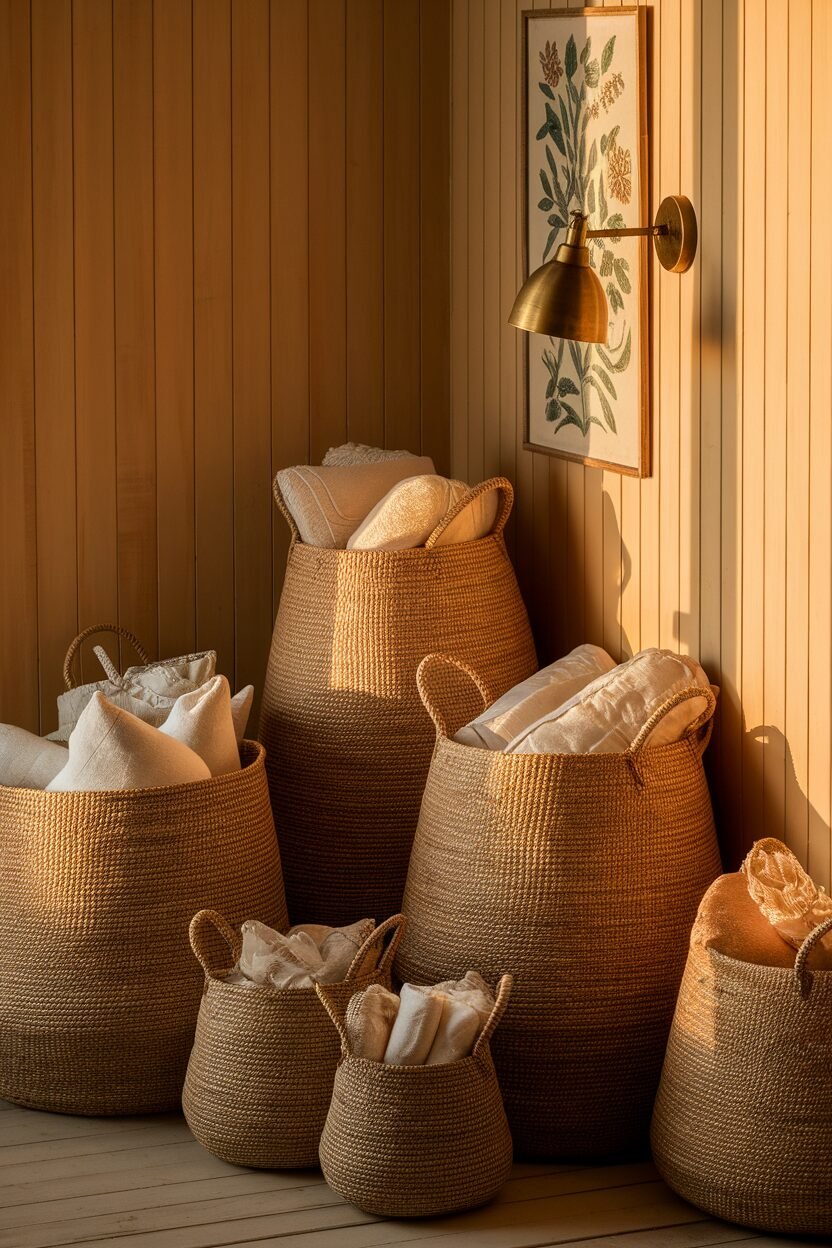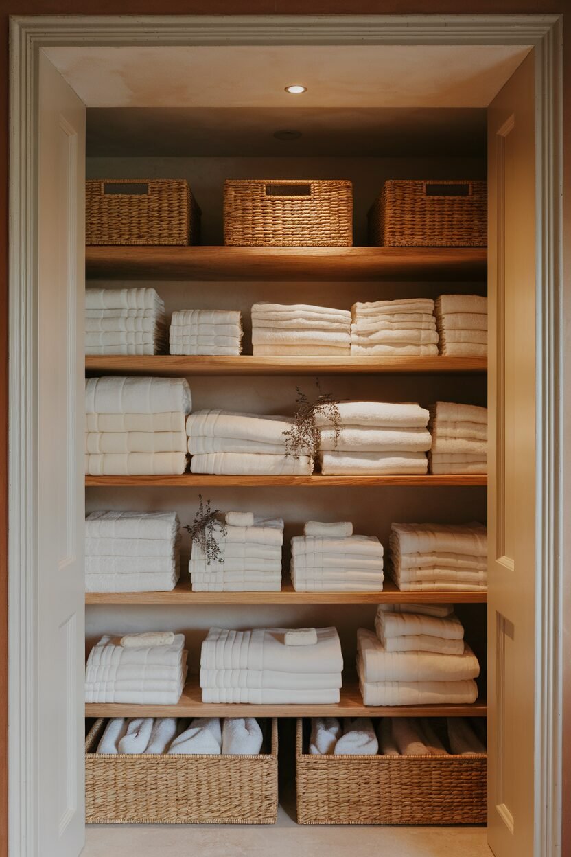 Sort linens by type and use baskets to keep them neat. This brings order and luxury to your closet.