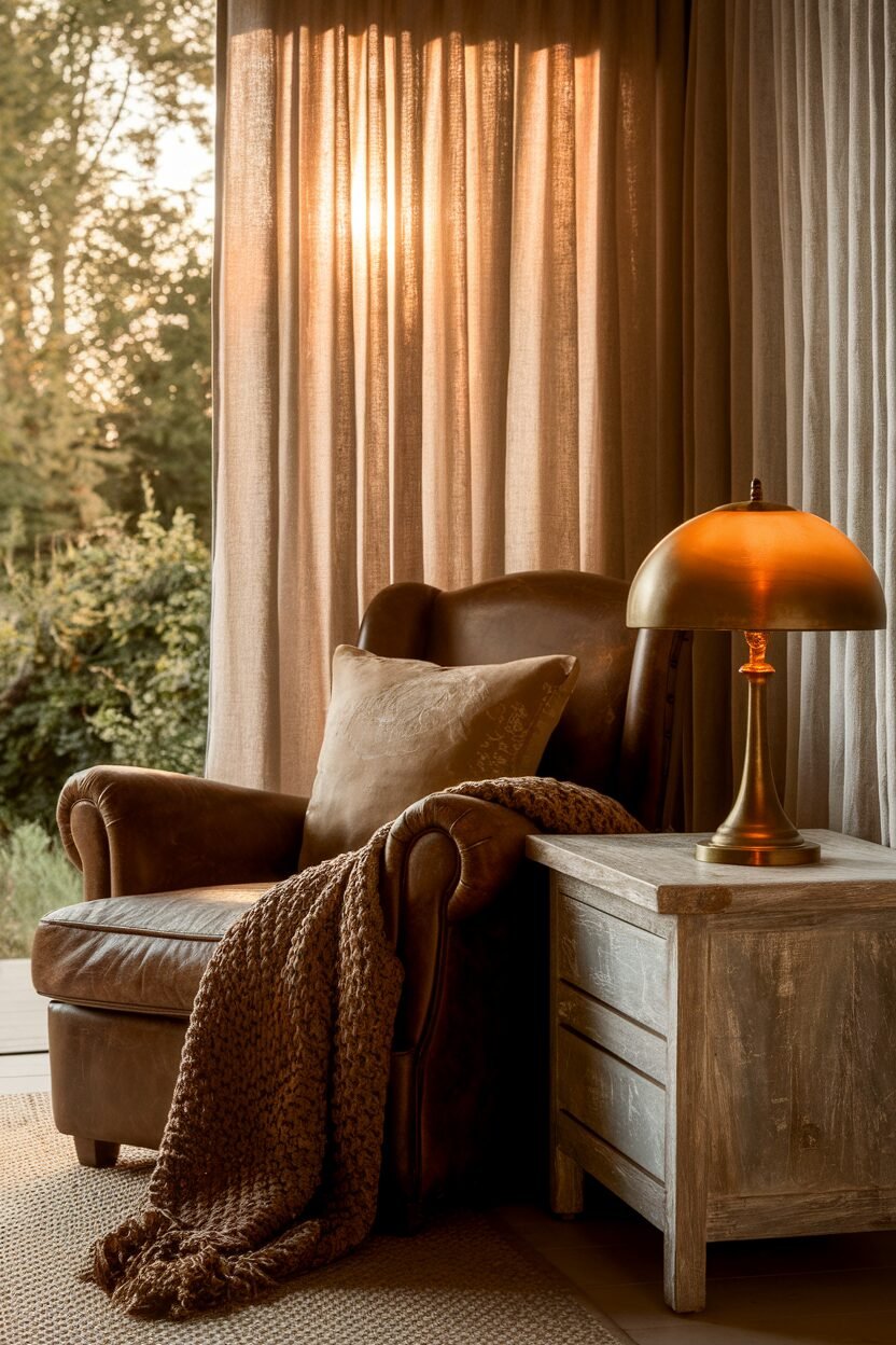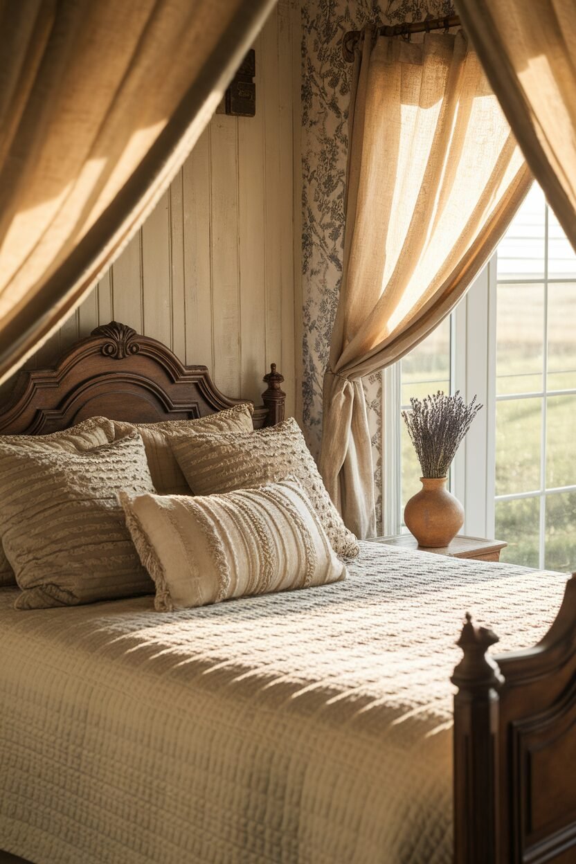 Incorporate wooden furniture with a distressed finish or exposed beams. Textures like wool throws and cotton sheets add comfort and warmth.