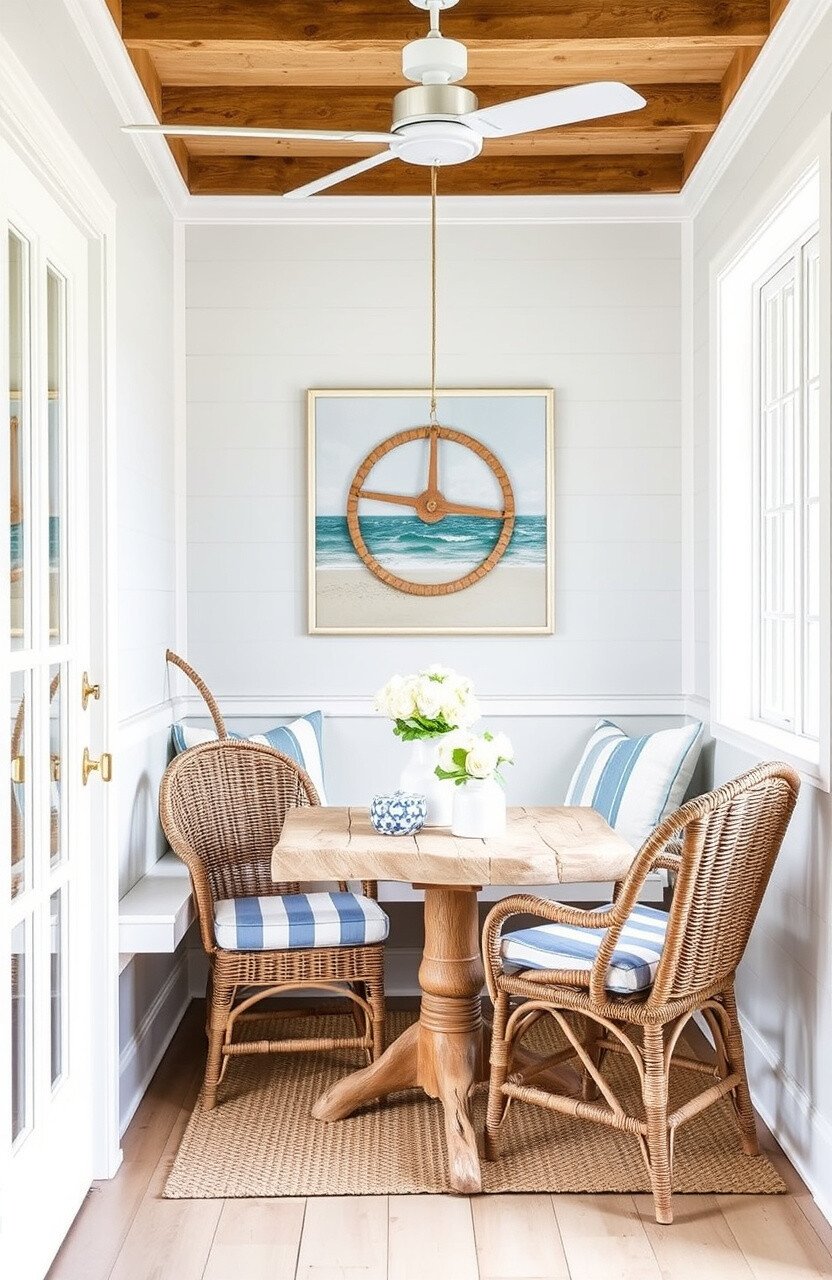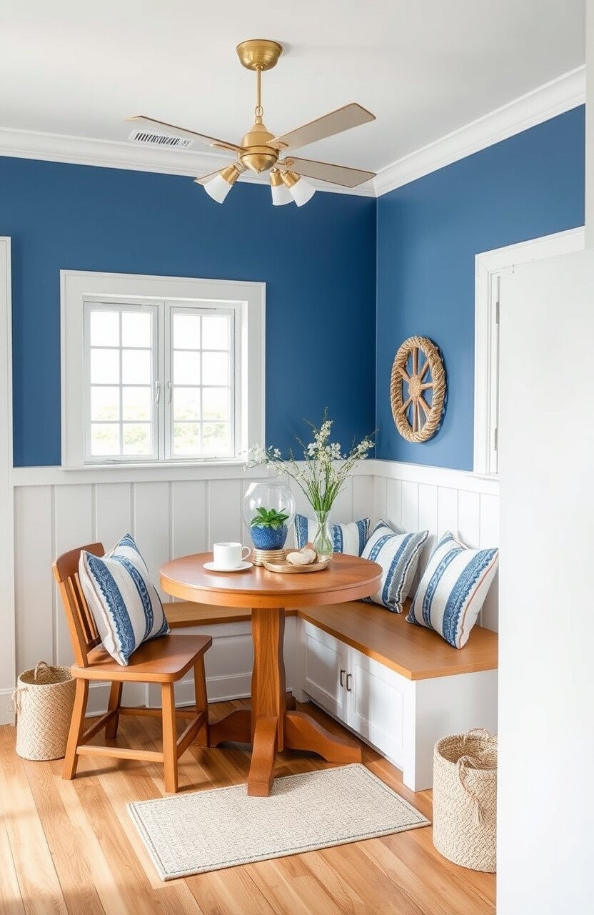 Bring the beach home with a coastal-themed nook. Light blues, whites, and sandy tones create a relaxing atmosphere.