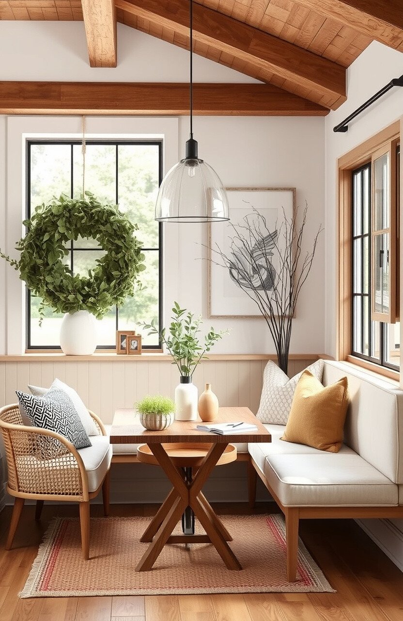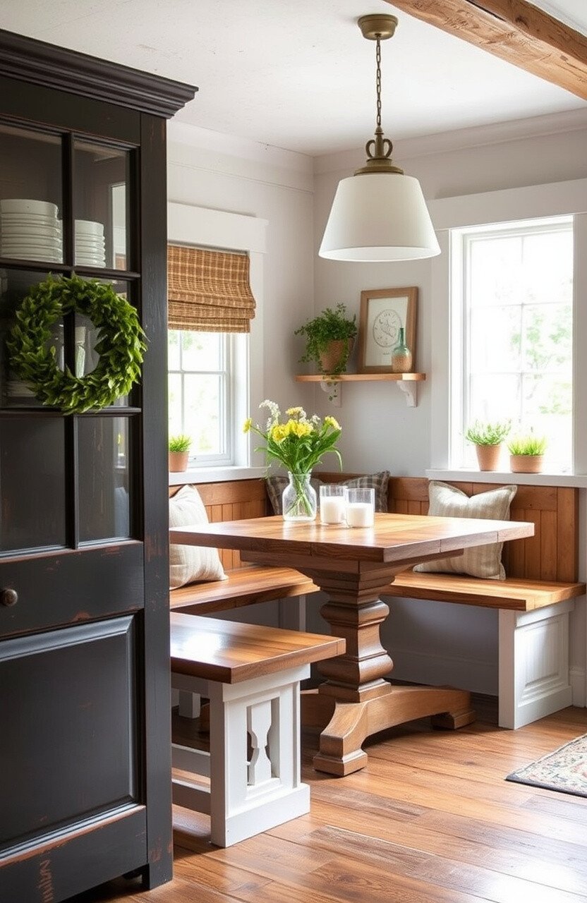 Farmhouse style brings a touch of countryside charm into your nook. Wooden benches and a sturdy table make it feel rustic yet modern.
