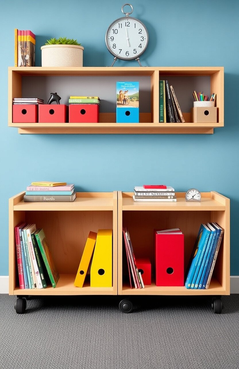 Rolling bookshelves offer flexible storage solutions. They make it easy to move books and supplies around the classroom.