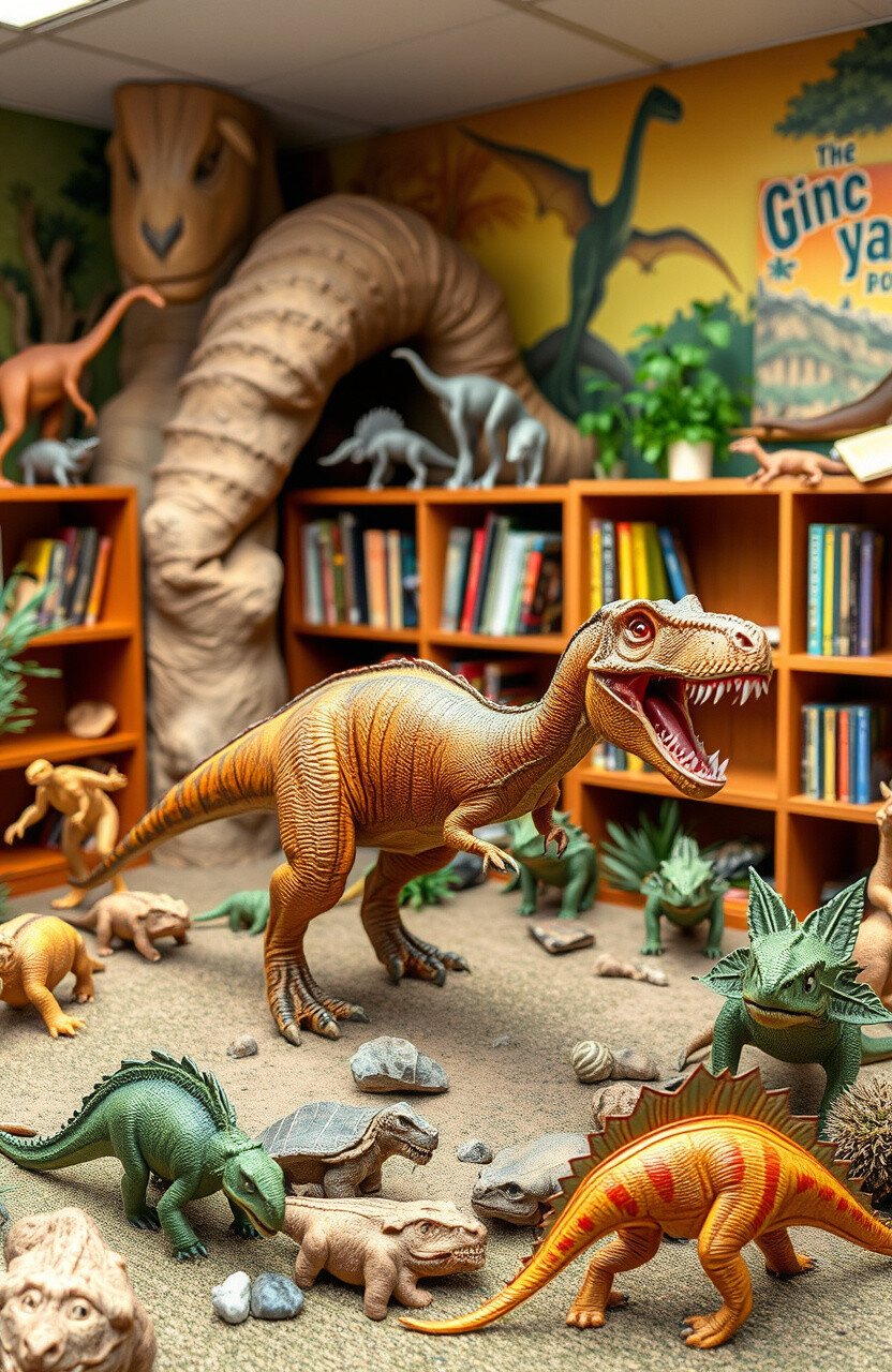 A dinosaur discovery zone is filled with fossils, models, and books. It’s a prehistoric adventure.