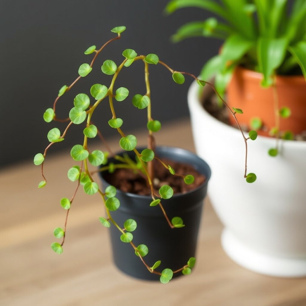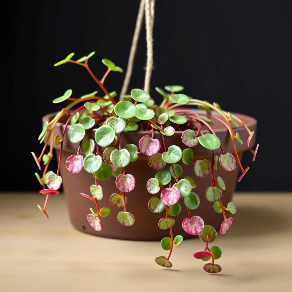 Maidenhair Vine is a delicate plant with small, round leaves on thin, trailing stems.