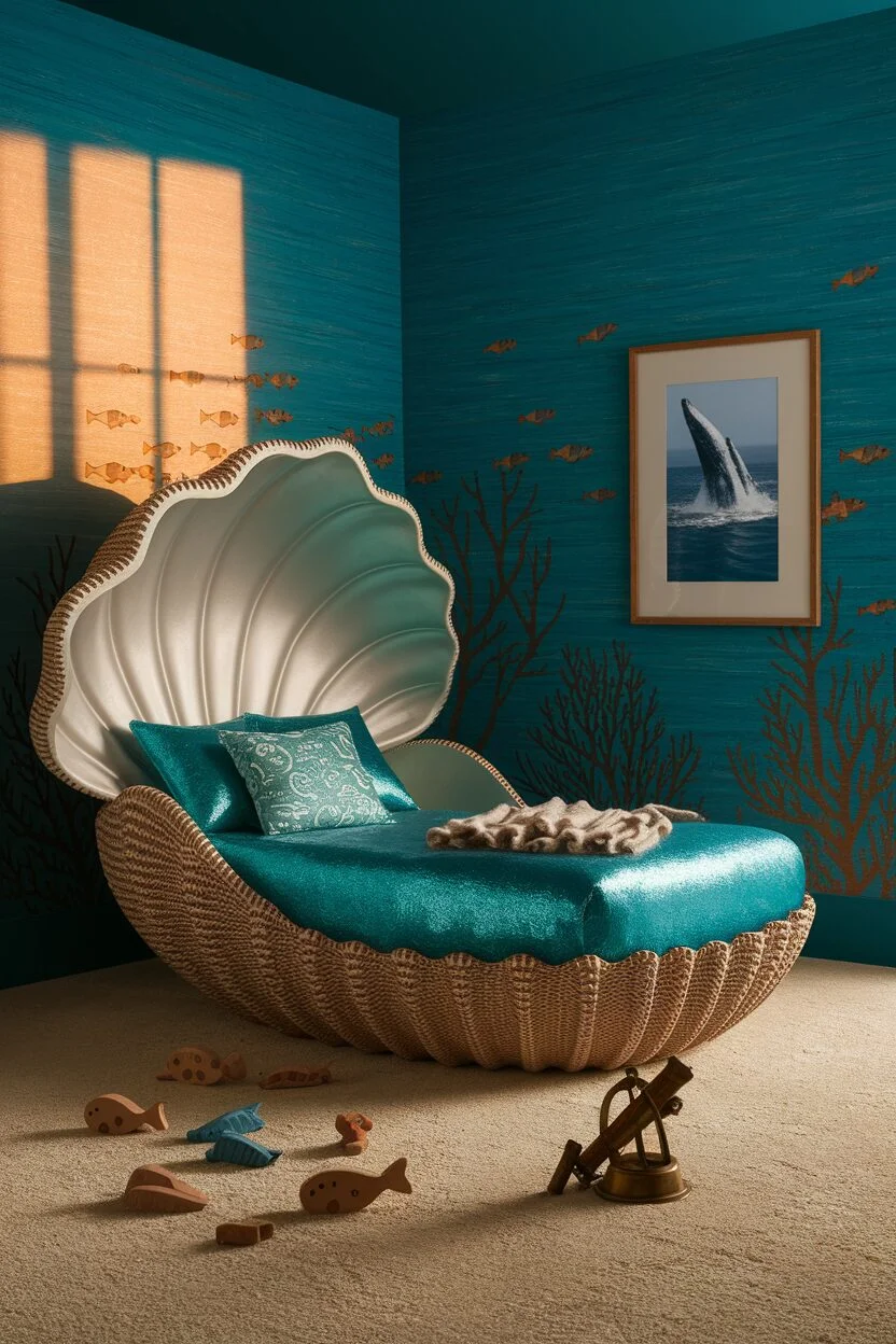 Unique features like a boat-shaped bed add whimsy. Use seashells and starfish to enhance the ocean vibe.