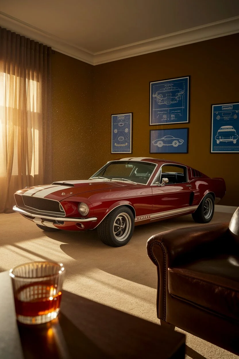 Vintage car posters and tire-shaped rugs set the scene. This theme fuels a love for history and design.