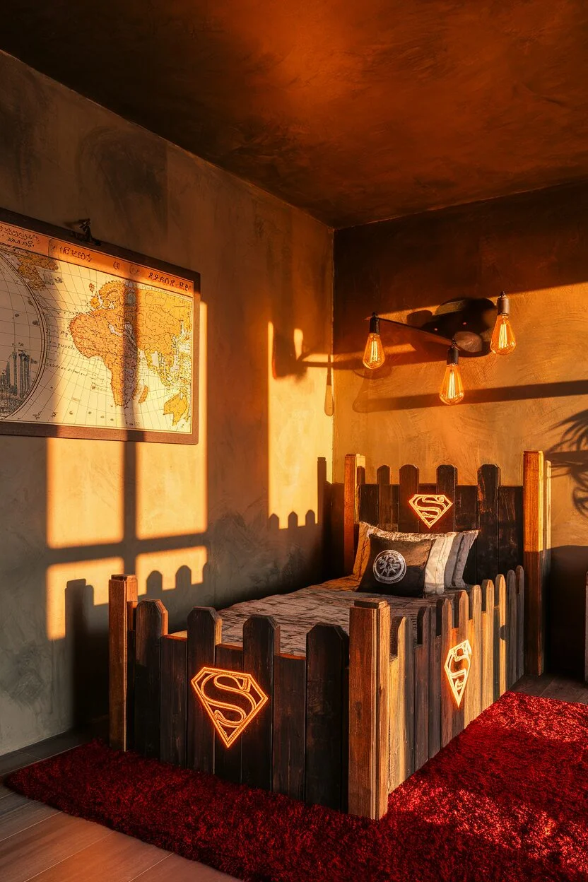Unique elements like a cape hanger or action figure display add fun. Use superhero logos and colors for a dynamic look.