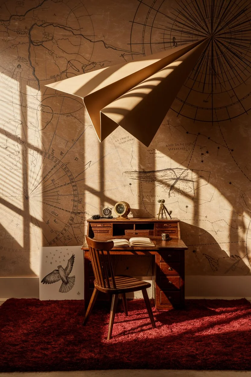 Unique elements like a tent bed or treasure chest storage add charm. Use maps and globes to inspire dreams of exploration.