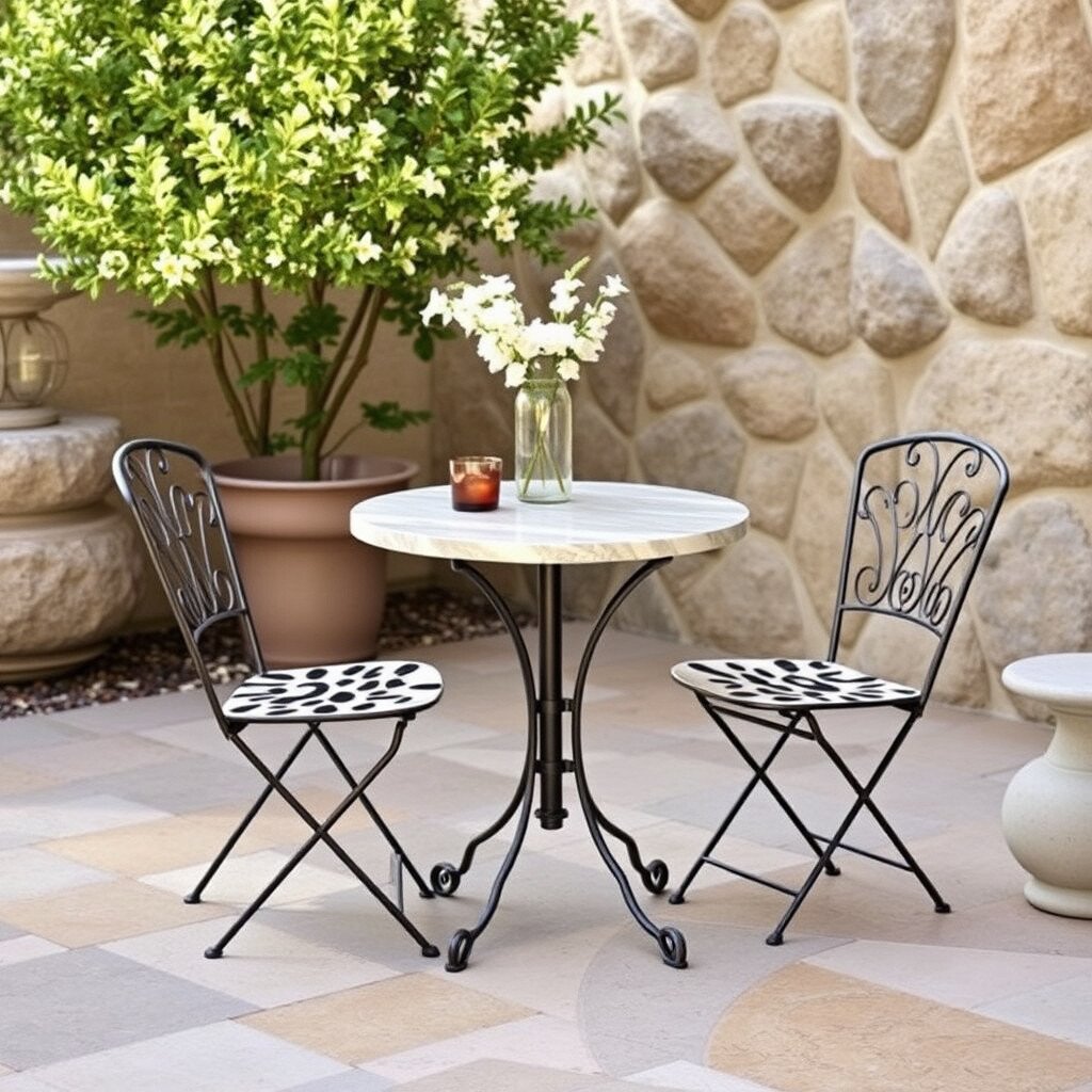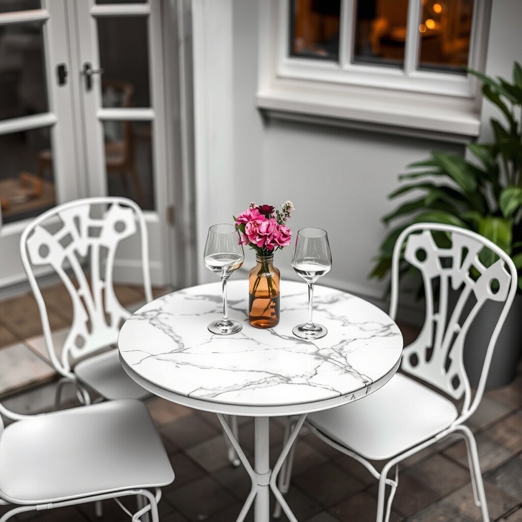 For a sophisticated touch, choose a bistro set with a marble tabletop. The smooth, glossy surface is undeniably chic.