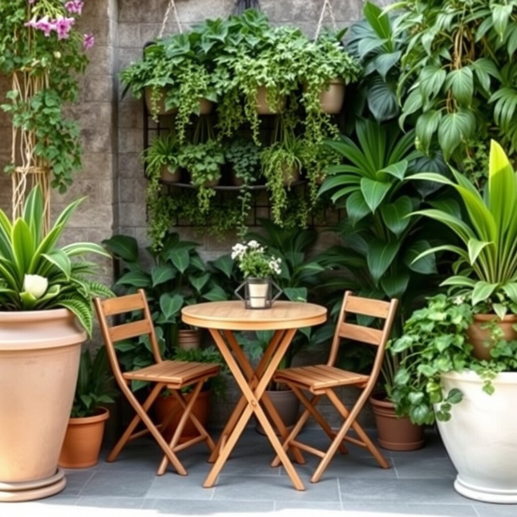 For a lush, green oasis, opt for a bistro set surrounded by plants. Choose natural materials like wood or stone to complement the greenery.