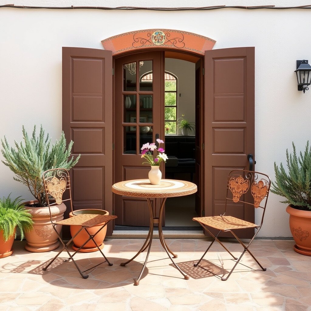 Create a Mediterranean retreat with a bistro set featuring terracotta tones and mosaic designs. The warm colors are inviting and charming.