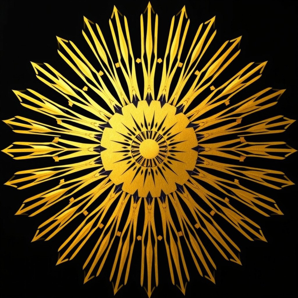 Picture a sunburst made up of geometric patterns in gold, creating a sense of order and symmetry.