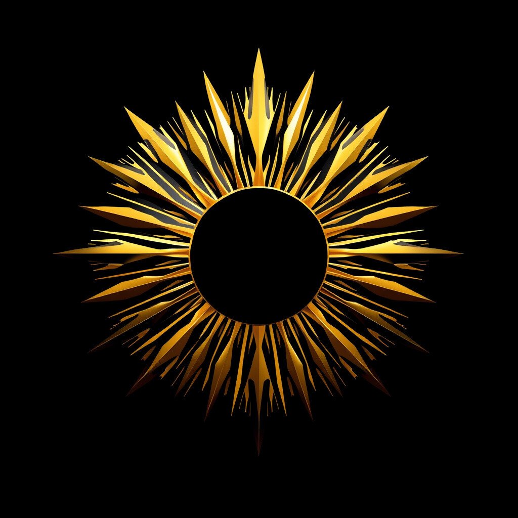 Imagine a sunburst with bold, angular lines, reminiscent of the Art Deco movement, in gold against black.