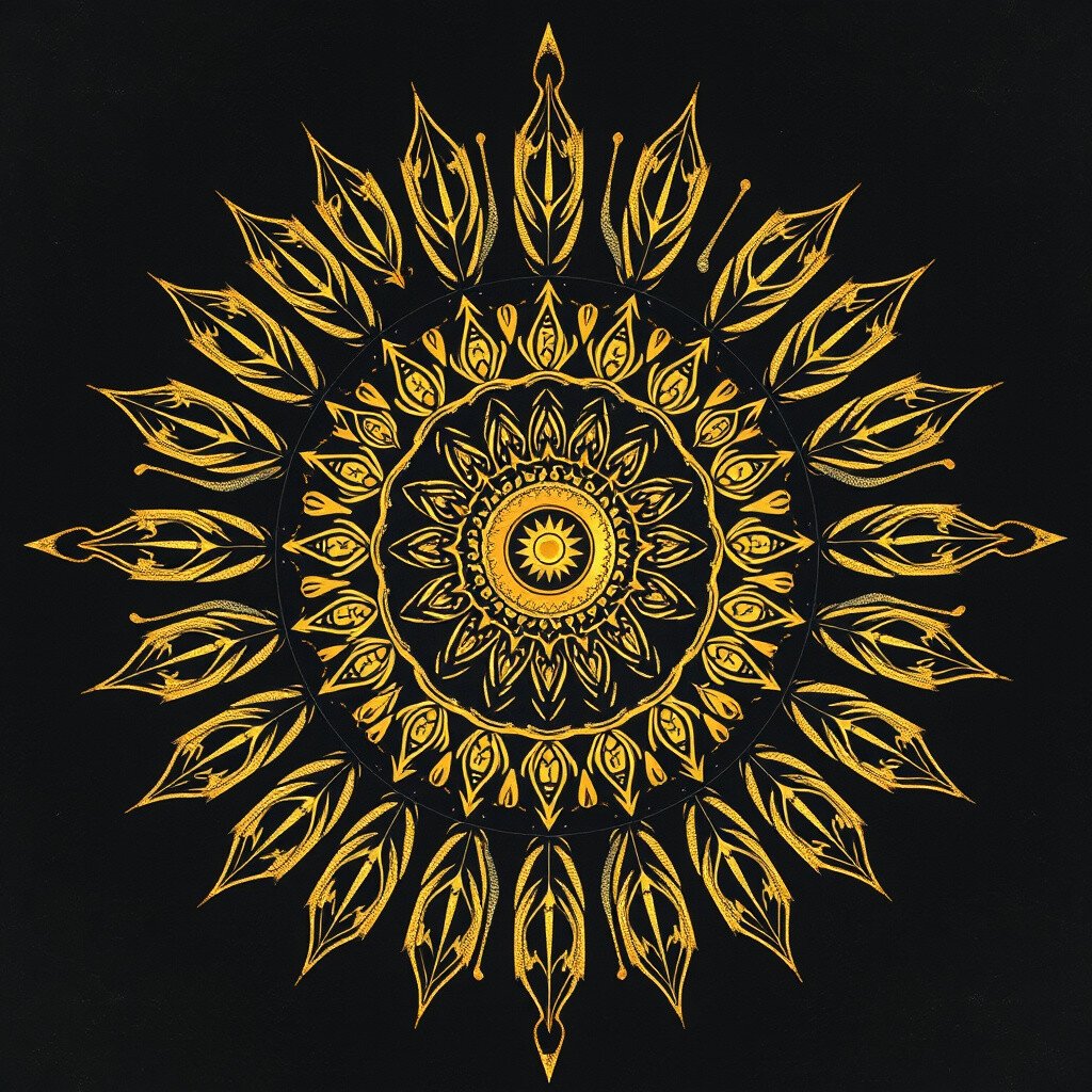 Visualize a sunburst combined with the intricate patterns of a mandala, all in shimmering gold.