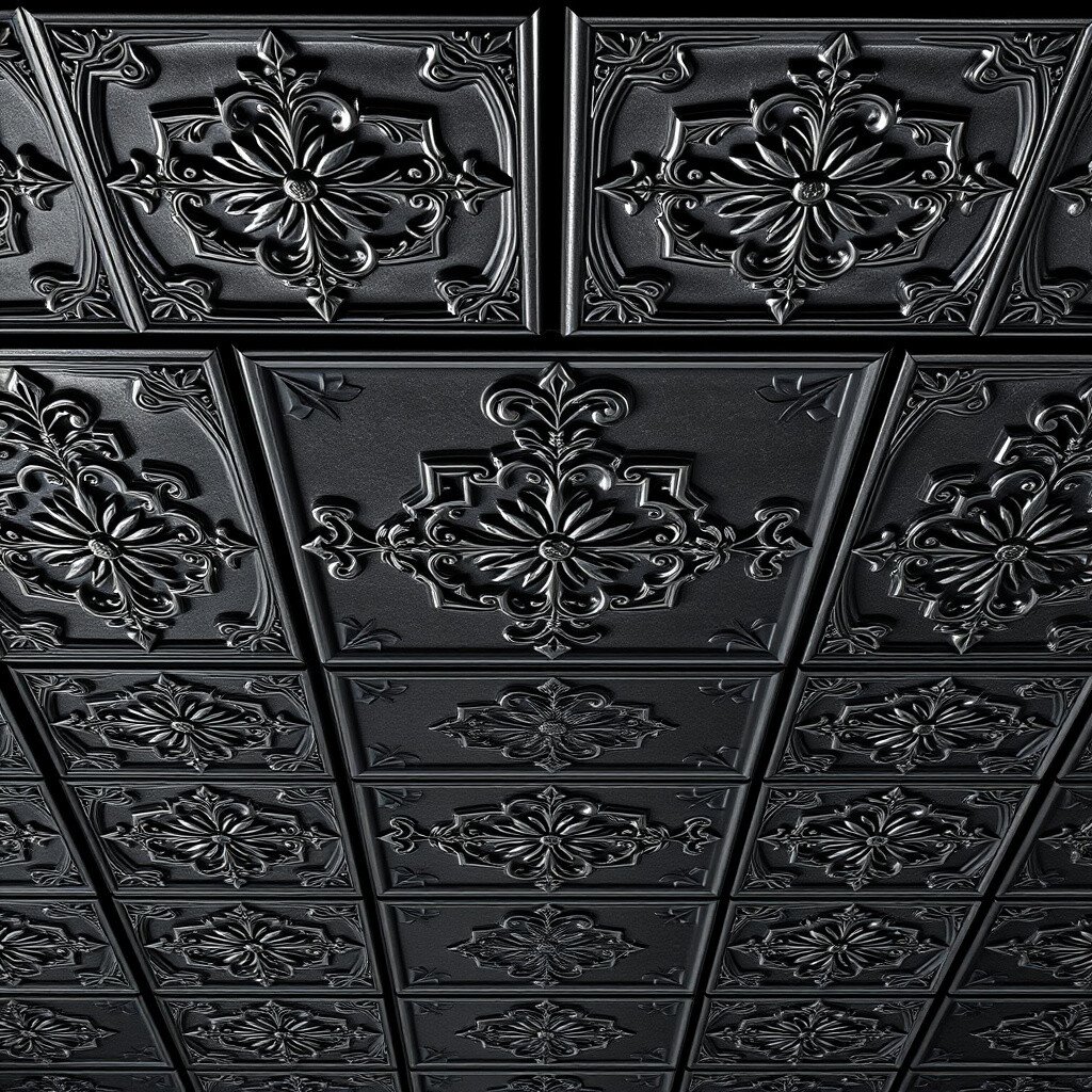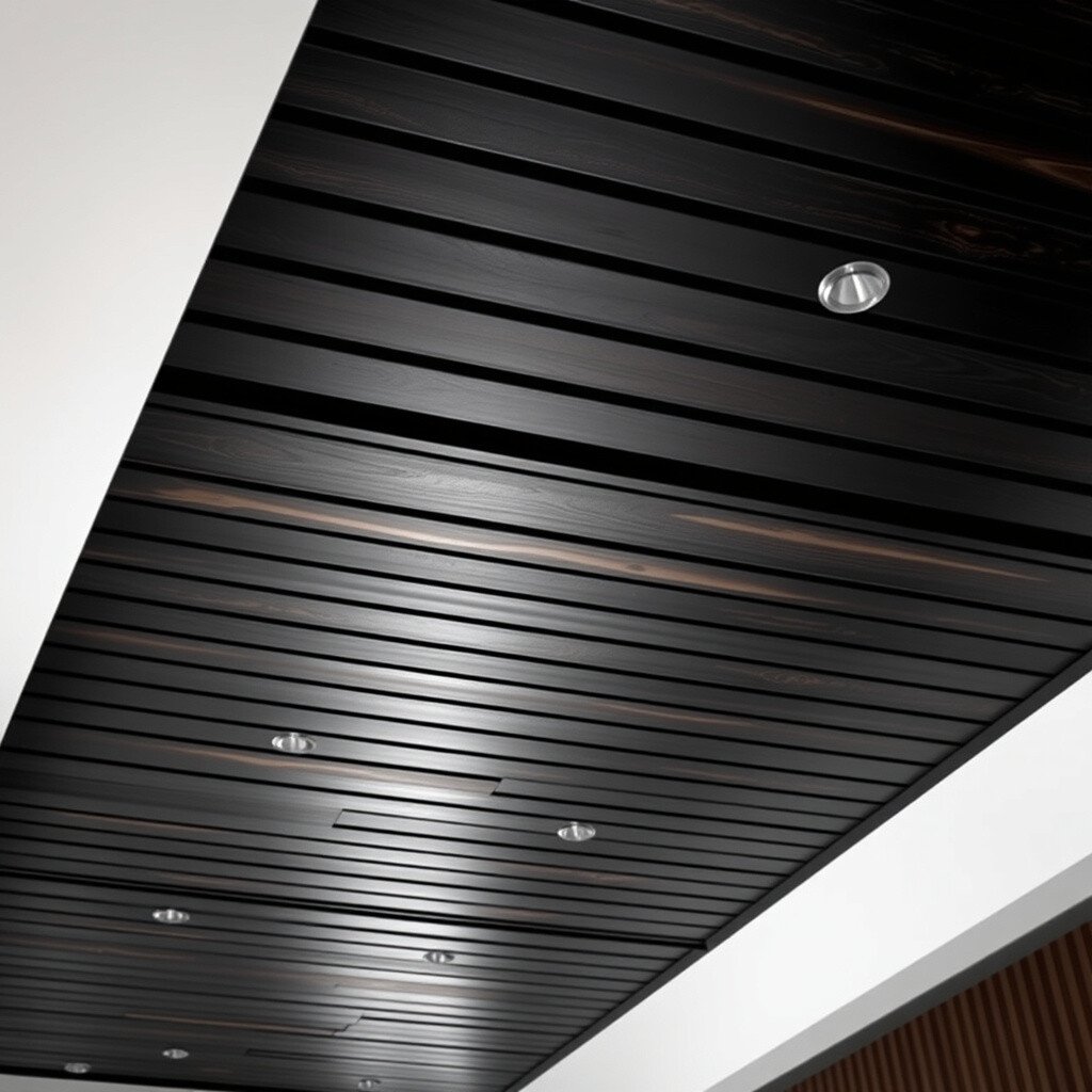 Imagine a ceiling with matte black metal panels. It’s like having a sleek suit for your room.