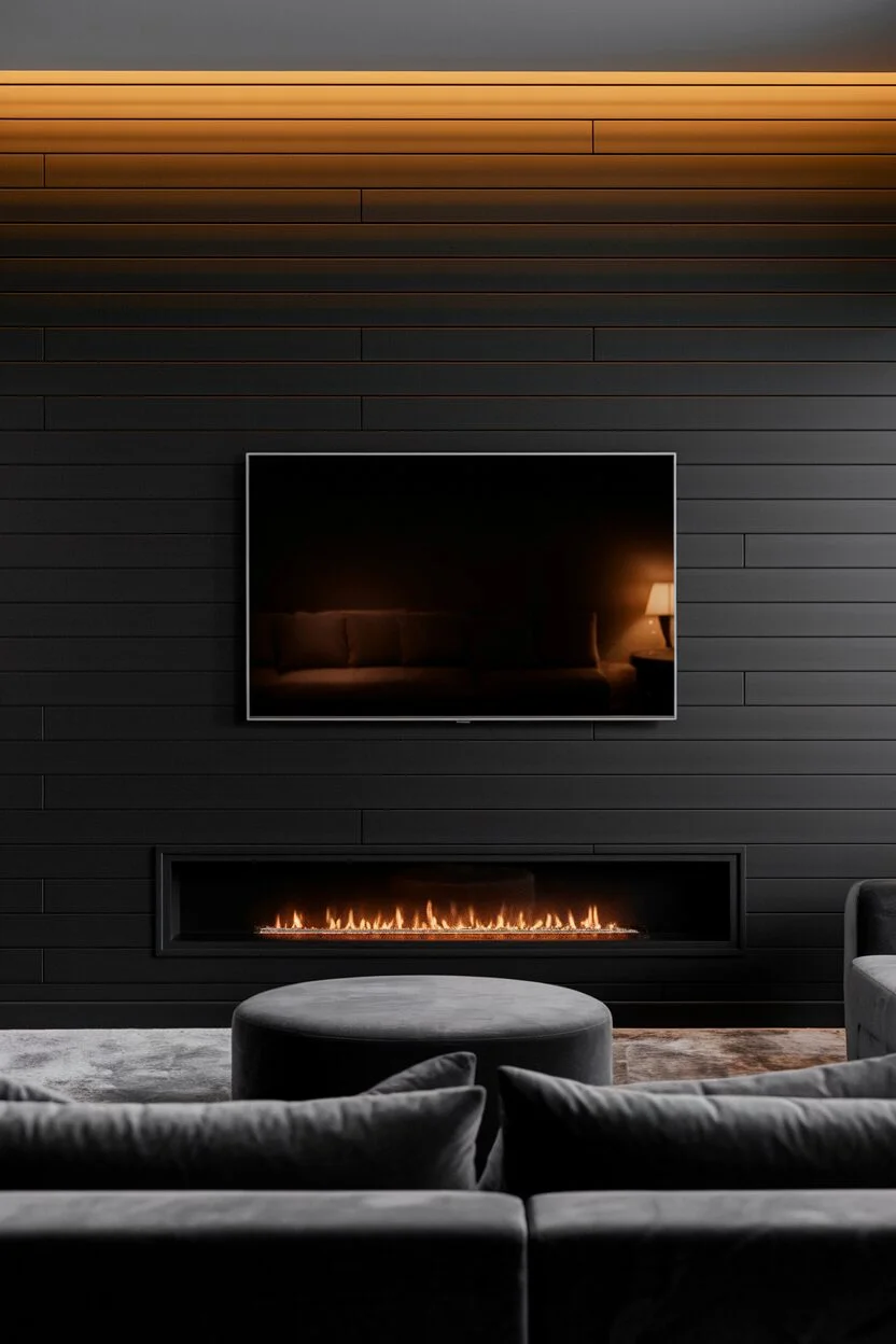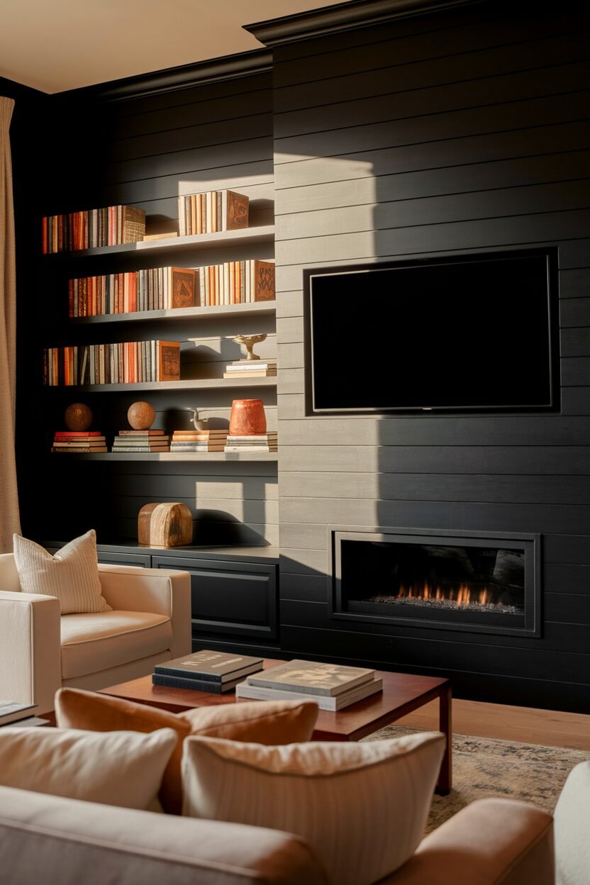 Imagine a black shiplap wall framing a warm, cozy fireplace. This can create an inviting atmosphere around your TV, making it perfect for chilly nights.