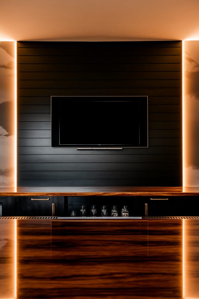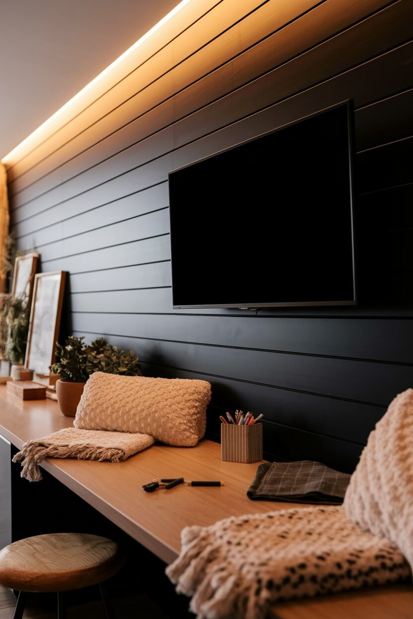 If you’re all about clean lines and a clutter-free space, a sleek black shiplap wall might be your new best friend. This design pairs beautifully with a flat-screen TV that seems to float against the wall.