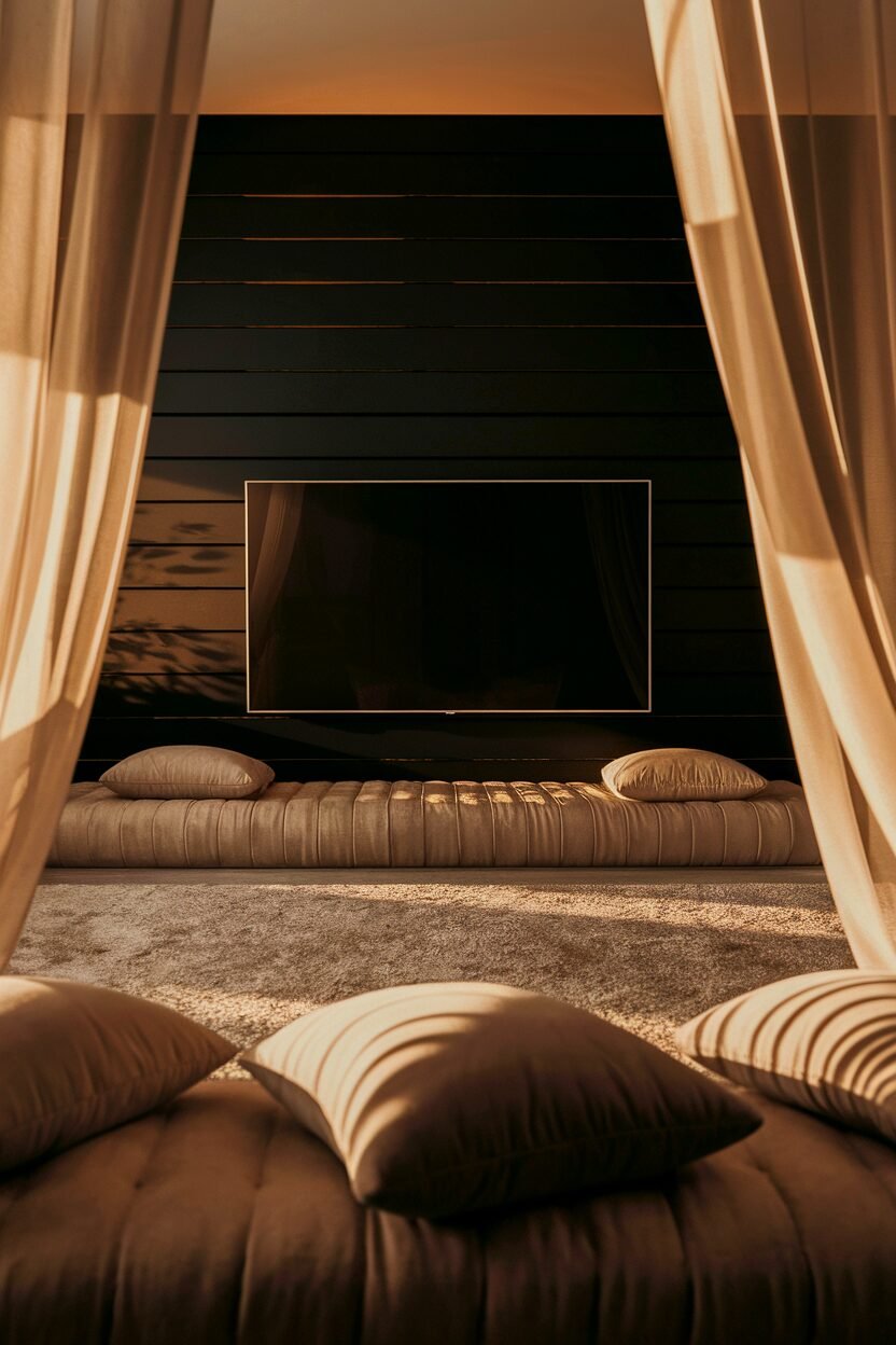 Create a peaceful meditation space against your black shiplap wall. This can be a serene spot for relaxation and mindfulness while keeping your TV area cozy.