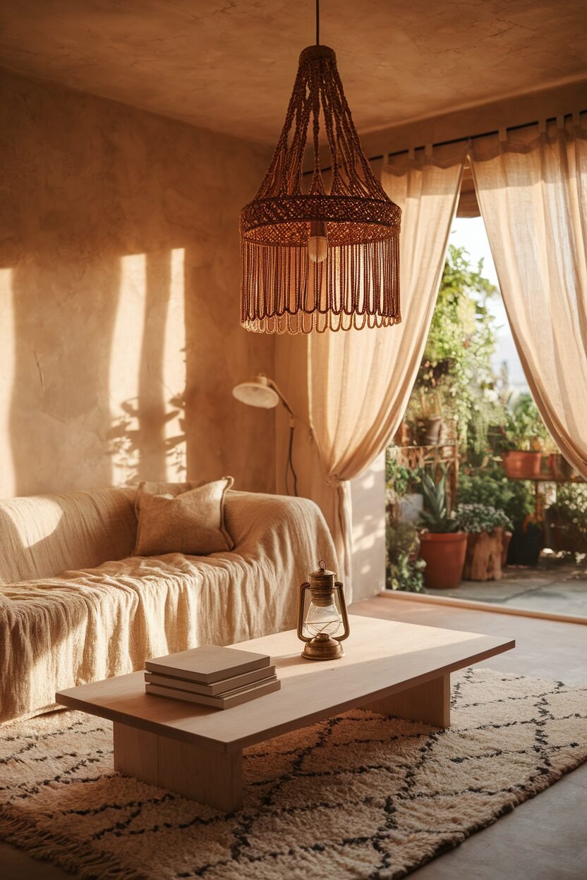 Illuminate your space with bohemian lighting fixtures like woven pendant lights or vintage lamps. These add both function and style.
