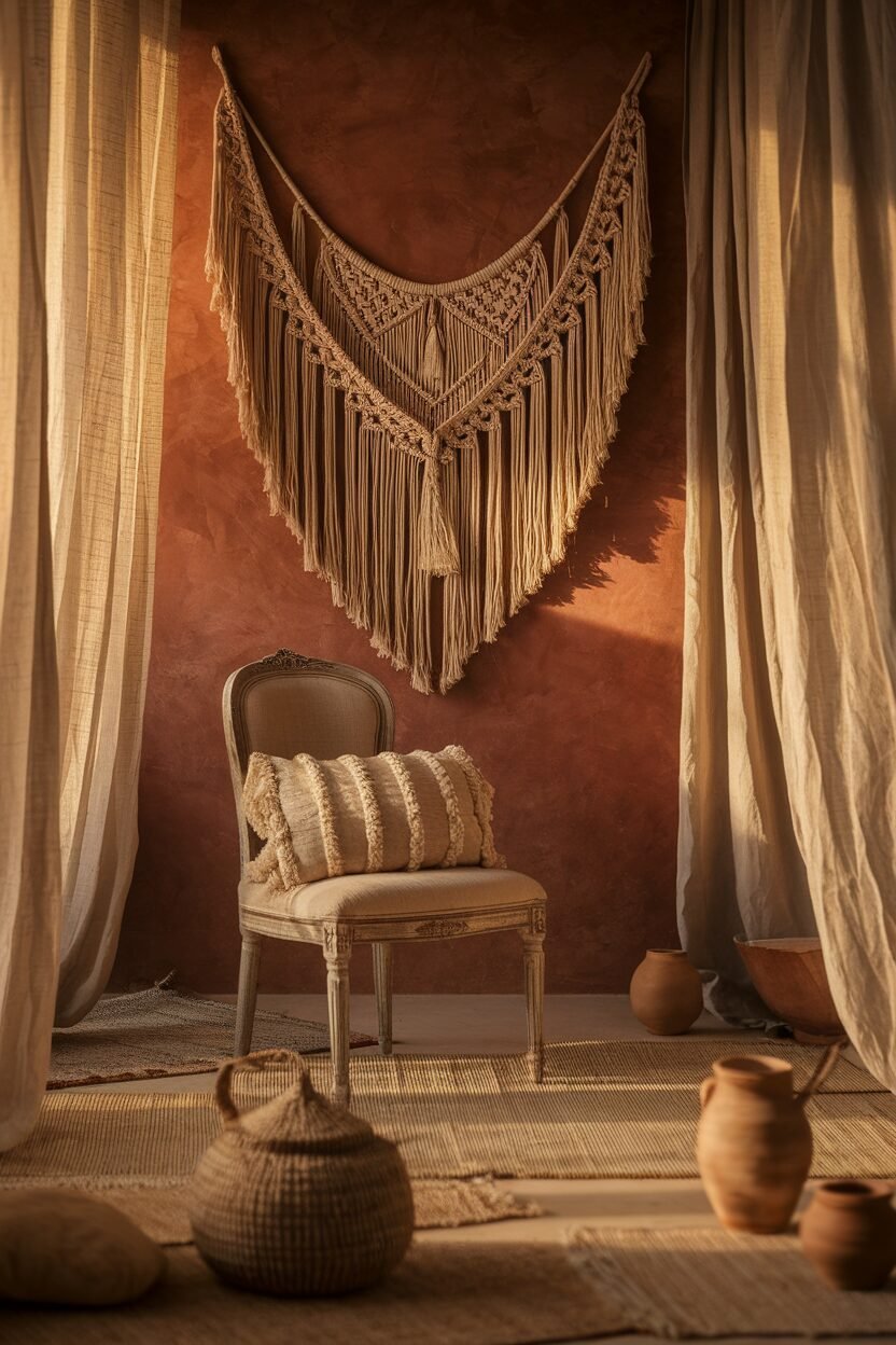 Macramé wall hangings add an artistic touch that’s both chic and relaxed. They bring a hand-crafted feel to your space.