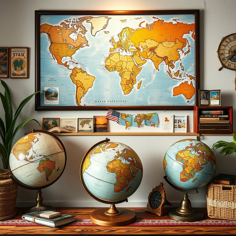 Display items like globes, postcards, or textiles from different cultures. They create a sense of wanderlust and curiosity.