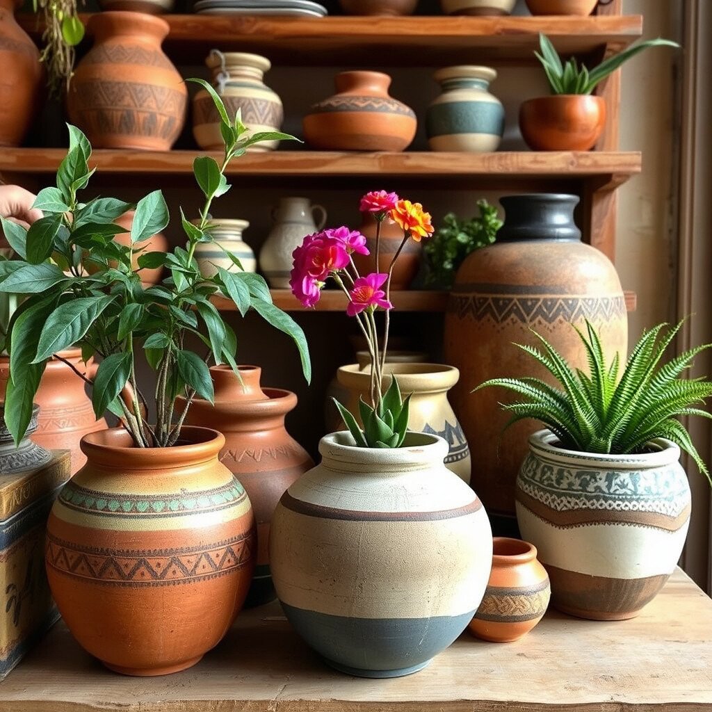 Use pottery for plant pots, vases, or even as decorative pieces on shelves. The natural materials and textures fit perfectly with boho style.