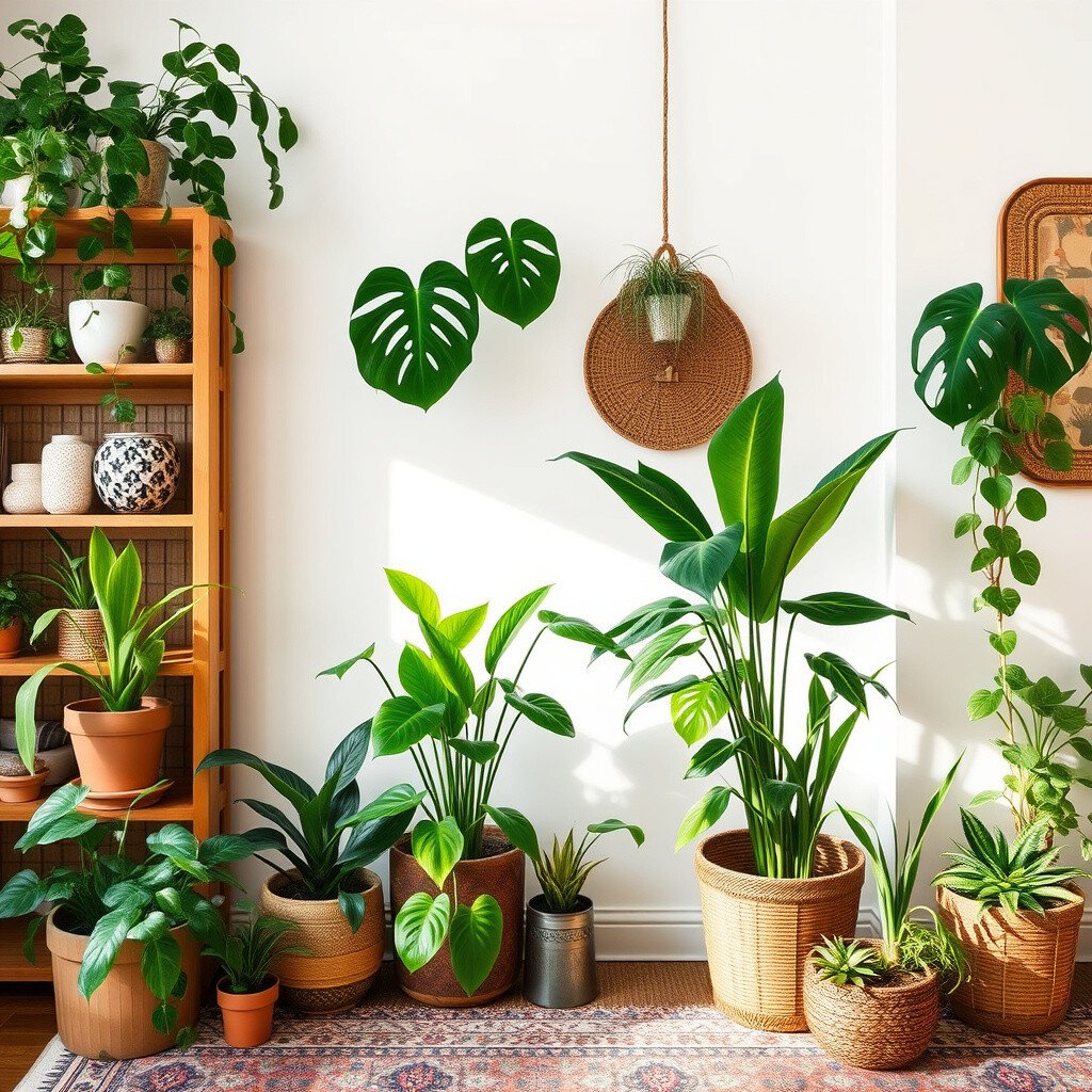 Mix large leafy plants with small succulents for variety. They not only look great but also improve air quality and boost your mood.