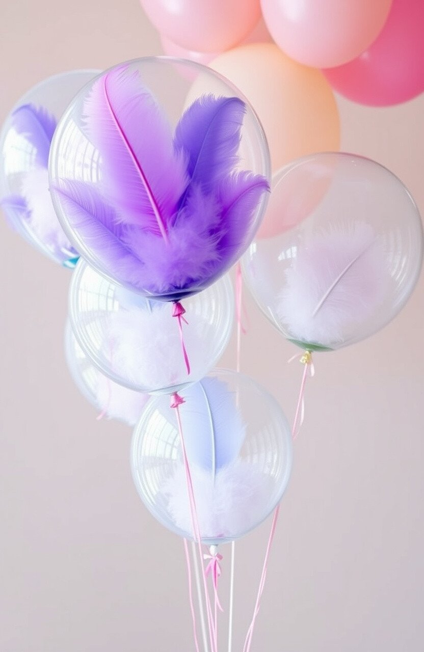 Feather-filled balloons bring a light, airy feel to your party. Imagine translucent balloons with fluffy feathers floating inside, as if capturing the essence of flight. They’re a hit among kids and adults alike.