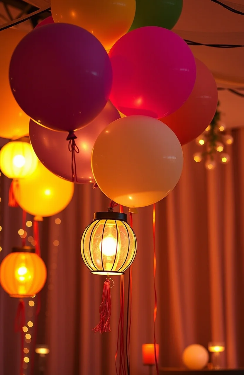 Balloons turned into lanterns create a warm glow. Use LED lights inside for a magical effect.