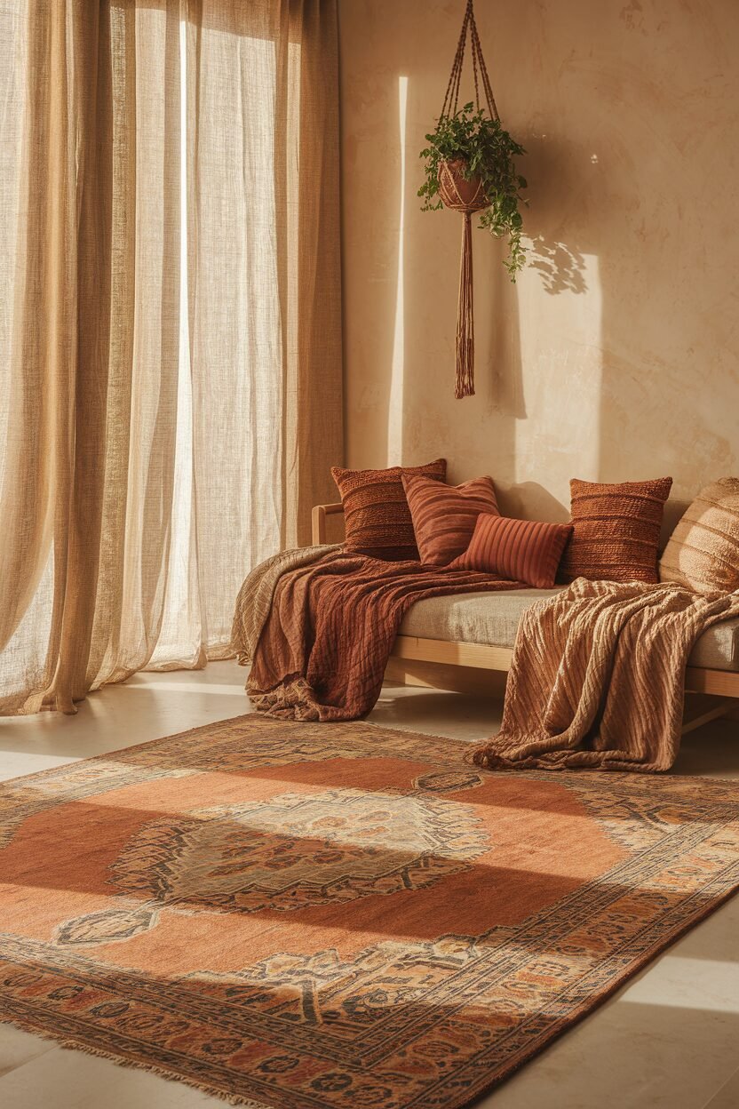 A vintage rug can be the cornerstone of your boho bedroom. It adds warmth and ties all your design elements together.