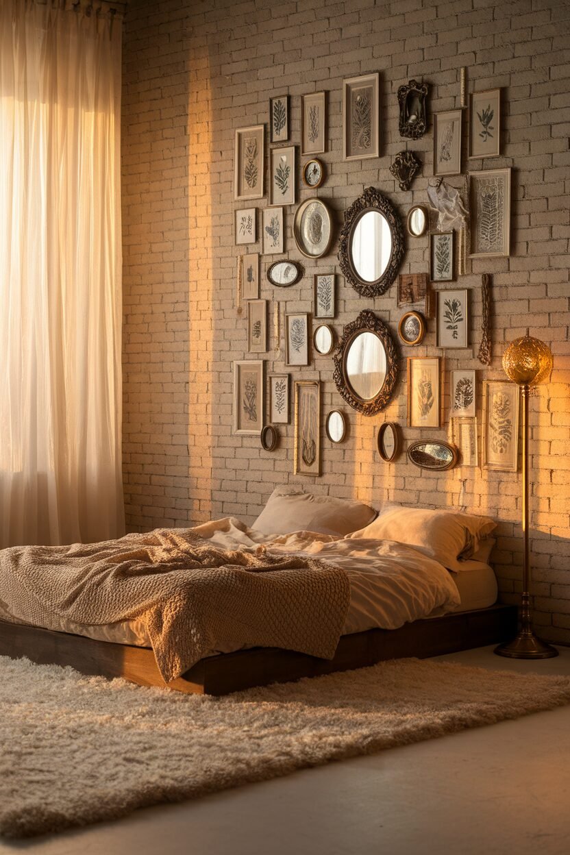 The uniqueness lies in the variety of styles and subjects, from abstract to landscapes. This approach makes your bedroom a visual delight.