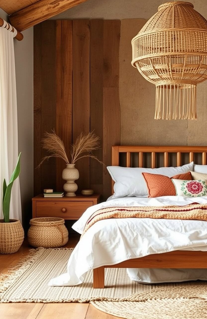 Using natural materials like wood, stone, and jute brings a grounding, organic feel to your bedroom. This is a core element of Boho chic style.