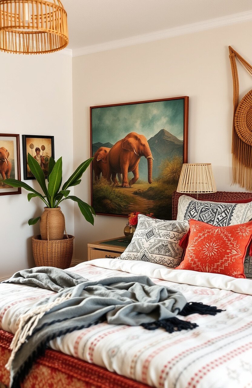 Handmade art brings a personal touch to your decor and supports artisans. It can be a central element in a Boho chic bedroom.