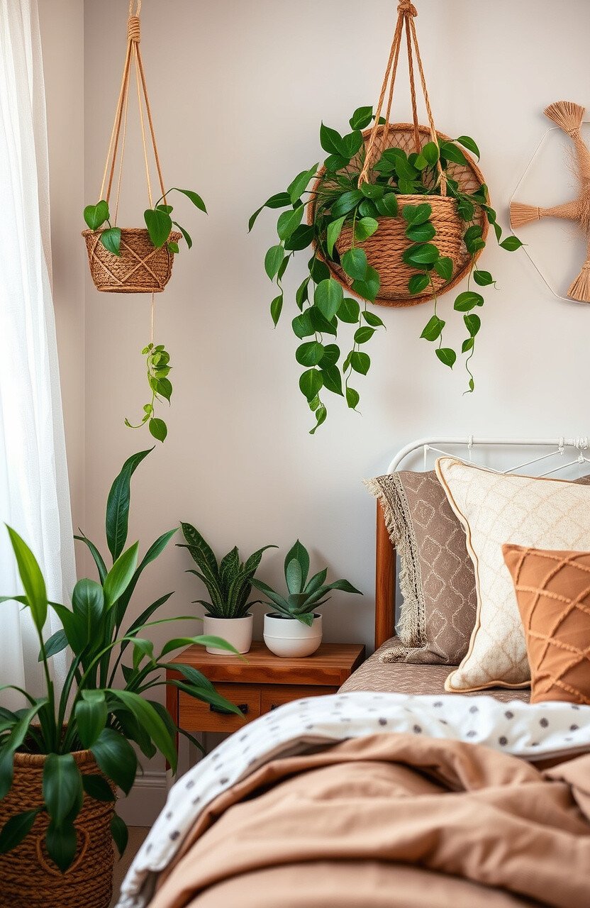 Choose easy-to-care-for varieties like succulents, snake plants, or pothos. Display them in woven baskets or hanging planters to complete the look.